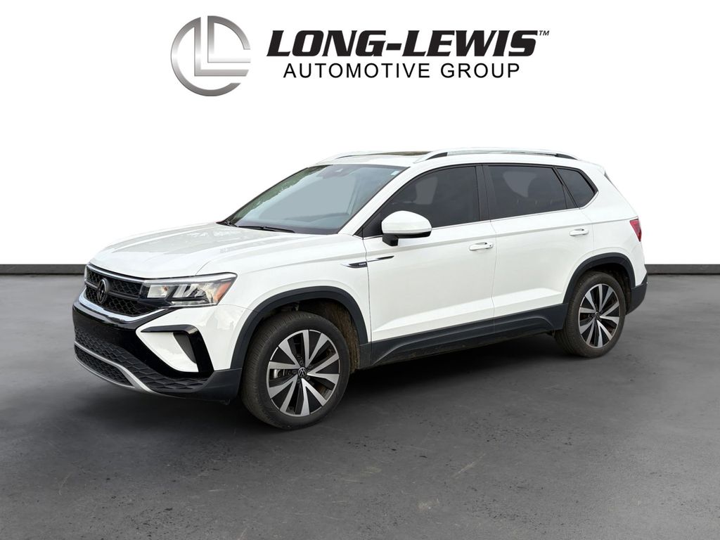 2023 Volkswagen Taos 1.5T SE Certified. Pure White 1.5T SE FWD 8-Speed Automatic with Tiptronic 1.5L I4 Turbocharged DOHC 16V LEV3-SULEV30 158hp Volkswagen Certified, 3.23 Axle Ratio, 4-Wheel Disc Brakes, 6 Speakers, ABS brakes, Active Blind Spot Monitor, Air Conditioning, Alloy wheels, AM/FM radio: SiriusXM with 360L, Auto High-beam Headlights, Auto-Dimming Rearview Mirror (SRV) (DISC), Brake assist, Bumpers: body-color, Cargo Area Retractable Privacy Cover, CloudTex & Cloth Seating Surfaces, Compass, Delay-off headlights, Driver door bin, Driver vanity mirror, Dual front impact airbags, Dual front side impact airbags, Electronic Stability Control, Emergency communication system: VW Car-Net Safe & Secure 5-year, Exterior Parking Camera Rear, First Aid Kit, Front anti-roll bar, Front Bucket Seats, Front Center Armrest, Front reading lights, Front Strut Rear Torsion Beam Suspension, Front wheel independent suspension, Fully automatic headlights, Heated door mirrors, Heated Front Comfort Seats, Heated front seats, Heated steering wheel, Illuminated entry, Leather Shift Knob, Low tire pressure warning, Occupant sensing airbag, Outside temperature display, Overhead airbag, Overhead console, Panic alarm, Panoramic Sunroof Package, Passenger door bin, Passenger vanity mirror, Power door mirrors, Power driver seat, Power steering, Power windows, Radio data system, Radio: MIB3 Composition Media AM/FM/HD, Rain sensing wipers, Rear anti-roll bar, Rear seat center armrest, Rear Sensors Credit, Rear window defroster, Rear window wiper, Remote keyless entry, Roadside Assistance Kit, Roof rack: rails only, Rubber Mats Kit (SNM), Security system, Speed control, Speed-sensing steering, Split folding rear seat, Spoiler, Steering wheel mounted audio controls, Tachometer, Telescoping steering wheel, Tilt steering wheel, Traction control, Trip computer, Variably intermittent wipers, Wheels: 18" 2-Tone Machined Alloy.