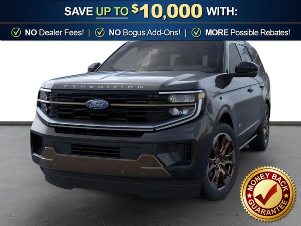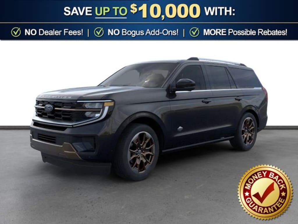 2026 Ford Expedition King Ranch NFT Agate Black Metallic King Ranch NFT 4WD 10-Speed Automatic EcoBoost 3.5L V6 GTDi DOHC 24V Twin Turbocharged 4WD, 22 Speakers, 3.73 Axle Ratio, 3rd row seats: split-bench, 4-Wheel Disc Brakes, ABS brakes, Adaptive suspension, Adjustable pedals, Air Conditioning, Alloy wheels, AM/FM radio: SiriusXM with 360L, Apple CarPlay/Android Auto, Auto High-beam Headlights, Auto-dimming door mirrors, Auto-dimming Rear-View mirror, Automatic temperature control, Brake assist, Bumpers: body-color, Compass, Delay-off headlights, Driver door bin, Driver vanity mirror, Dual front impact airbags, Dual front side impact airbags, Electronic Stability Control, Emergency communication system: 911 Assist, Exterior Parking Camera Rear, Ford Connectivity Package (1-Year Included), Ford Digital Experience, Four wheel independent suspension, Front anti-roll bar, Front Bucket Seats, Front Center Armrest, Front dual zone A/C, Front reading lights, Fully automatic headlights, Garage door transmitter, Genuine wood dashboard insert, Genuine wood door panel insert, Heated door mirrors, Heated front seats, Heated rear seats, Heated steering wheel, Heated/Ventilated Premium Del Rio Leather Front Captain's Chairs, Illuminated entry, Leather steering wheel, Low tire pressure warning, Memory seat, Navigation System, Occupant sensing airbag, Outside temperature display, Overhead airbag, Overhead console, Panic alarm, Passenger door bin, Passenger vanity mirror, Pedal memory, Power door mirrors, Power driver seat, Power moonroof: Vista Roof, Power passenger seat, Power steering, Power windows, Radio data system, Radio: B&O Unleashed Sound System by Bang & Olufsen, Rain sensing wipers, Rear air conditioning, Rear anti-roll bar, Rear reading lights, Rear window defroster, Rear window wiper, Reclining 3rd row seat, Remote keyless entry, Security system, SiriusXM with 360L, Speed control, Speed-sensing steering, Speed-Sensitive Wipers, Split folding rear seat, Spoiler, Steering wheel memory, Steering wheel mounted audio controls, Tachometer, Telescoping steering wheel, Tilt steering wheel, Traction control, Trip computer, Turn signal indicator mirrors, Variably intermittent wipers, Ventilated front seats, Voltmeter, Wheels: 22" x 9.0" Diamond Cut Machined Face Aluminum, 4WD.