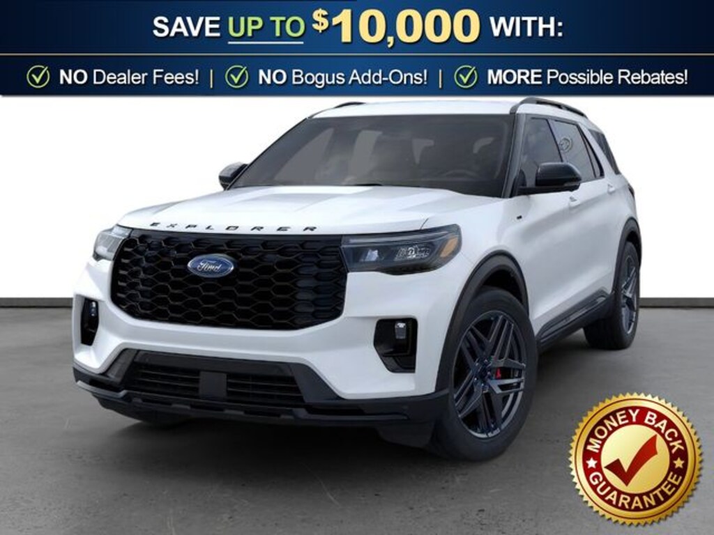 2026 Ford Explorer ST-Line NFT Star White Metallic Tri-Coat ST-Line NFT RWD 10-Speed Automatic 2.3L EcoBoost I-4 10 Speakers, 110V/150W AC Power Outlet, 2nd Row Captain's Chairs w/E-Z Entry and Armrest, 2nd Row Heated Seats, 3rd row seats: bench, 4-Wheel Disc Brakes, ABS brakes, Air Conditioning, Alloy wheels, AM/FM radio: SiriusXM with 360L, Ambient Lighting, Apple CarPlay/Android Auto, Auto High-beam Headlights, Auto-Dimming Interior Rear-View Mirror, Automatic temperature control, Brake assist, Bumpers: body-color, Compass, Delay-off headlights, Driver door bin, Driver vanity mirror, Dual front impact airbags, Dual front side impact airbags, Electronic Stability Control, Emergency communication system: 911 Assist, Exterior Parking Camera Rear, Four wheel independent suspension, Front anti-roll bar, Front Bucket Seats, Front Center Armrest, Front dual zone A/C, Front fog lights, Front reading lights, Fully automatic headlights, Garage door transmitter, Heated door mirrors, Heated front seats, Heated steering wheel, Heated Unique Cloth Captain's Chairs, Illuminated entry, Knee airbag, Leather steering wheel, Low tire pressure warning, Manual-Folding Sideview Mirrors, Memory Driver's Seat, Navigation System, Occupant sensing airbag, Outside temperature display, Overhead airbag, Overhead console, Panic alarm, Passenger door bin, Passenger vanity mirror, Performance Brakes, Power door mirrors, Power driver seat, Power Liftgate, Power passenger seat, Power steering, Power windows, Premium Package, Radio: B&O Sound System by Bang and Olufsen, Rain-Sensing Wipers (front Only), Rear air conditioning, Rear anti-roll bar, Rear reading lights, Rear window defroster, Rear window wiper, Red Painted Performance Front and Rear Brake Calipers, Remote keyless entry, Security system, Speed control, Speed-sensing steering, Speed-Sensitive Wipers, Split folding rear seat, Spoiler, ST-Line Street Pack, Steering wheel mounted audio controls, Tachometer, Telescoping steering wheel, Tilt steering wheel, Traction control, Trip computer, Variably intermittent wipers, Wheels: 20" Ebony-Painted Machined Aluminum, Wheels: 21" Magnetite-Painted Aluminum.