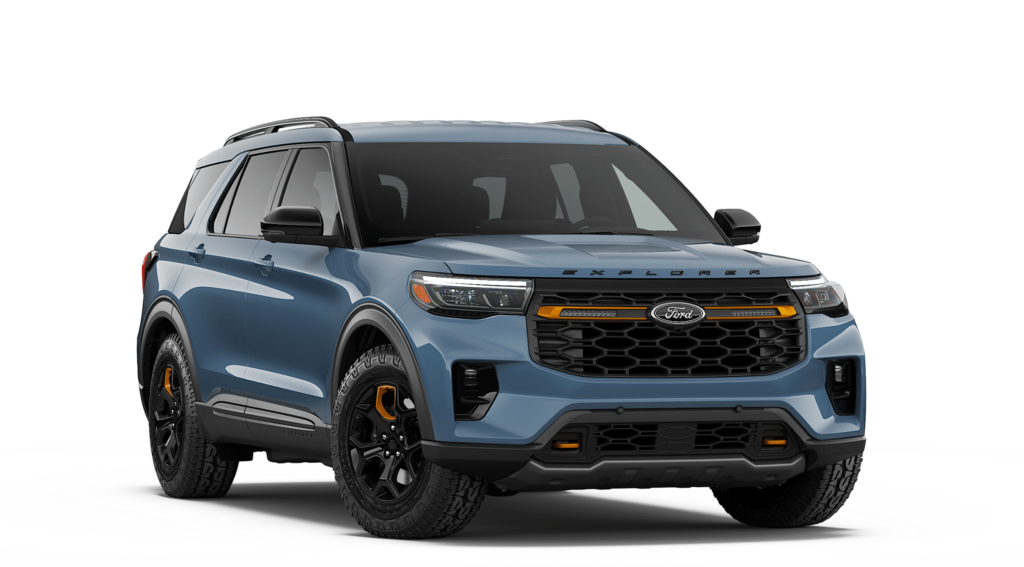 Vapor Blue Metallic 2026 Ford Explorer 4WD 10-Speed Automatic 2.3L EcoBoost I-4 4WD, 10 Speakers, 3rd row seats: bench, 4-Wheel Disc Brakes, ABS brakes, Air Conditioning, Alloy wheels, AM/FM radio: SiriusXM with 360L, Apple CarPlay/Android Auto, Auto High-beam Headlights, Automatic temperature control, Brake assist, Bumpers: body-color, Compass, Delay-off headlights, Driver door bin, Driver vanity mirror, Dual front impact airbags, Dual front side impact airbags, Electronic Stability Control, Emergency communication system: 911 Assist, Exterior Parking Camera Rear, Four wheel independent suspension, Front anti-roll bar, Front Bucket Seats, Front Center Armrest, Front dual zone A/C, Front fog lights, Front License Plate Bracket, Front reading lights, Fully automatic headlights, Heated door mirrors, Heated front seats, Heated rear seats, Heated steering wheel, Heated/Ventilated Miko Captain's Chairs, Illuminated entry, Knee airbag, Leather steering wheel, Low tire pressure warning, Navigation System, Occupant sensing airbag, Outside temperature display, Overhead airbag, Overhead console, Panic alarm, Passenger door bin, Passenger vanity mirror, Power door mirrors, Power driver seat, Power Liftgate, Power passenger seat, Power steering, Power windows, Radio: B&O Sound System by Bang & Olufsen, Rear air conditioning, Rear anti-roll bar, Rear reading lights, Rear window defroster, Rear window wiper, Remote keyless entry, SecuriCode Keyless Entry Keypad, Security system, Speed control, Speed-sensing steering, Speed-Sensitive Wipers, Split folding rear seat, Spoiler, Sport steering wheel, Steering wheel mounted audio controls, Tachometer, Telescoping steering wheel, Tilt steering wheel, Traction control, Trip computer, Variably intermittent wipers, Ventilated front seats, Wheels: 18" High Gloss Black-Painted Aluminum, 4WD.
