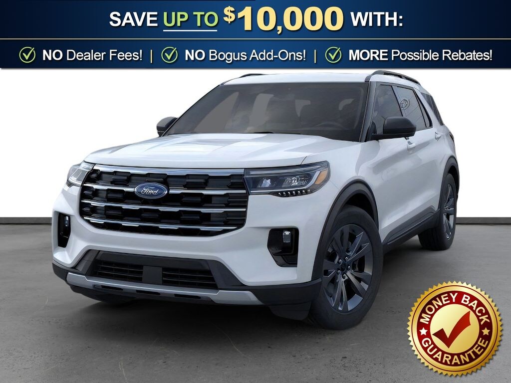 Space White Metallic 2026 Ford Explorer Active NFT 4WD 10-Speed Automatic 2.3L EcoBoost I-4 4WD, 3rd row seats: bench, 4-Wheel Disc Brakes, 6 Speakers, ABS brakes, Air Conditioning, Alloy wheels, AM/FM radio: SiriusXM with 360L, AM/FM Stereo, Apple CarPlay/Android Auto, Auto High-beam Headlights, Automatic temperature control, Brake assist, Bumpers: body-color, Compass, Delay-off headlights, Driver door bin, Driver vanity mirror, Dual front impact airbags, Dual front side impact airbags, Electronic Stability Control, Emergency communication system: 911 Assist, Exterior Parking Camera Rear, Four wheel independent suspension, Front anti-roll bar, Front Bucket Seats, Front Center Armrest, Front dual zone A/C, Front License Plate Bracket, Front reading lights, Fully automatic headlights, Heated door mirrors, Illuminated entry, Knee airbag, Low tire pressure warning, Navigation System, Occupant sensing airbag, Outside temperature display, Overhead airbag, Overhead console, Panic alarm, Passenger door bin, Passenger vanity mirror, Power door mirrors, Power driver seat, Power steering, Power windows, Rear air conditioning, Rear anti-roll bar, Rear reading lights, Rear window defroster, Rear window wiper, Remote keyless entry, Security system, Speed control, Speed-sensing steering, Speed-Sensitive Wipers, Split folding rear seat, Spoiler, Steering wheel mounted audio controls, Tachometer, Telescoping steering wheel, Tilt steering wheel, Traction control, Trip computer, Variably intermittent wipers, Wheels: 18" Sparkle Silver-Painted Aluminum, 4WD.