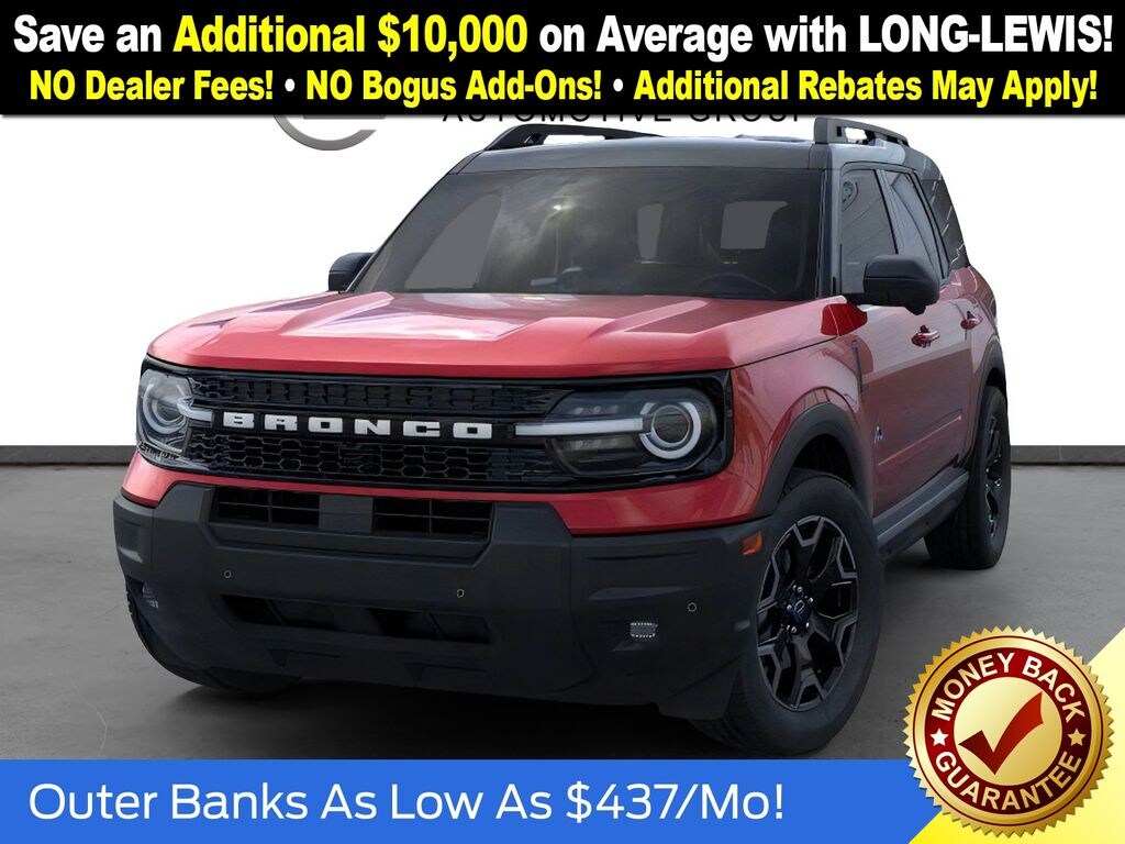 Ruby Red Metallic Tinted Clearcoat 2025 Ford Bronco Sport Outer Banks fctp 4WD 8-Speed Automatic 1.5L EcoBoost 360-Degree Camera w/Trail & Split View, 4-Wheel Disc Brakes, 6 Speakers, ABS brakes, Air Conditioning, Alloy wheels, AM/FM radio: SiriusXM, AM/FM Stereo, Auto High-beam Headlights, Auto-dimming Rear-View mirror, Automatic temperature control, B&O Sound System by Bang & Olufsen, Brake assist, Compass, Connected Navigation, Delay-off headlights, Driver door bin, Driver vanity mirror, Dual front impact airbags, Dual front side impact airbags, Electronic Stability Control, Emergency communication system: SYNC 4 911 Assist, Four wheel independent suspension, Front anti-roll bar, Front Bucket Seats, Front Center Armrest, Front Driver/Passenger Seat Back Map Pockets, Front dual zone A/C, Front fog lights, Front License Plate Bracket, Front Parking Sensors, Front reading lights, Fully automatic headlights, Garage door transmitter, HD Radio, Heated door mirrors, Heated front seats, Heated steering wheel, Illuminated entry, Knee airbag, Low tire pressure warning, Memory seat, Occupant sensing airbag, Outer Banks Tech Package+, Outside temperature display, Overhead airbag, Overhead console, Panic alarm, Passenger door bin, Passenger vanity mirror, Power door mirrors, Power driver seat, Power passenger seat, Power steering, Power windows, Premium Trimmed Front Bucket Seats w/Ebony/Roast, Radio data system, Rain sensing wipers, Rear anti-roll bar, Rear Parking Sensors, Rear reading lights, Rear seat center armrest, Rear window defroster, Rear window wiper, Remote keyless entry, Reverse Brake Assist, Security system, SiriusXM, Speed control, Speed-sensing steering, Speed-Sensitive Wipers, Split folding rear seat, Steering wheel mounted audio controls, SYNC 4 w/Enhanced Voice Recognition, Tachometer, Telescoping steering wheel, Tilt steering wheel, Traction control, Trip computer, Variably intermittent wipers, Wheels: 18" Ebony Black-Painted Aluminum.