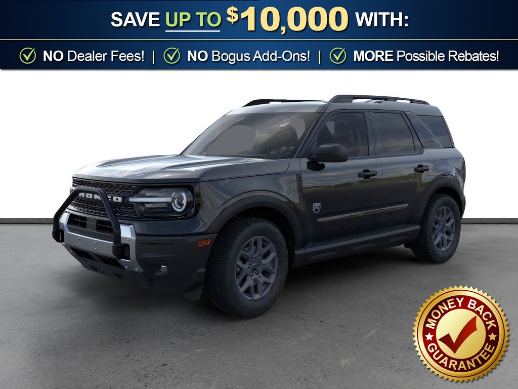 Shadow Black 2026 Ford Bronco Sport Big Bend fctp 4WD 8-Speed Automatic 1.5L EcoBoost 2nd Row Carpeted Seatback, 4-Wheel Disc Brakes, 400W Pro Power Onboard, 6 Speakers, ABS brakes, Air Conditioning, Alloy wheels, AM/FM radio: SiriusXM with 360L, AM/FM Stereo, Apple CarPlay/Android Auto, Auto High-beam Headlights, Automatic temperature control, Auxiliary Switches and Wiring, Black Diamond Off-Road Package, Brake assist, Class II Trailer Tow Package with Trailer Sway Control, Cloth with Easy-to-Clean Front Bucket Seats, Compass, Convenience Package, Delay-off headlights, Driver door bin, Driver vanity mirror, Dual front impact airbags, Dual front side impact airbags, Electronic Stability Control, Emergency communication system: SYNC 4 911 Assist, Exterior Parking Camera Rear, Ford Connectivity Package (1-Year Included), Four wheel independent suspension, Front anti-roll bar, Front Black Molded-in-Color (MIC) Bumper, Front Brush Guard, Front Bucket Seats, Front Center Armrest, Front Driver/Passenger Seat Back Map Pockets, Front License Plate Bracket, Front reading lights, Fully automatic headlights, Heated 8-Way Power Driver's Seat, Heated door mirrors, Illuminated entry, Internet access capable: 5G Modem - Ford Connectivity Package, Knee airbag, LED Fog Lamps, Liftgate with Black BRONCO SPORT Lettering, Low tire pressure warning, Occupant sensing airbag, Outside temperature display, Overhead airbag, Overhead console, Panic alarm, Passenger door bin, Passenger vanity mirror, Power door mirrors, Power steering, Power windows, Premium Wrapped Steering Wheel, Radio data system, Rear anti-roll bar, Rear Parking Sensors, Rear reading lights, Rear seat center armrest, Rear window defroster, Rear window wiper, Remote keyless entry, Security system, SiriusXM with 360L, Speed control, Speed-sensing steering, Speed-Sensitive Wipers, Split folding rear seat, Steering wheel mounted audio controls, SYNC 4 with Enhanced Voice Recognition, Tachometer, Telescoping steering wheel, Tilt steering wheel, Traction control, Trip computer, Variably intermittent wipers, Wheels: 17" Carbonized Gray Painted Aluminum, Wheels: 17" Carbonized Gray-Painted Aluminum.