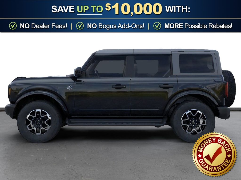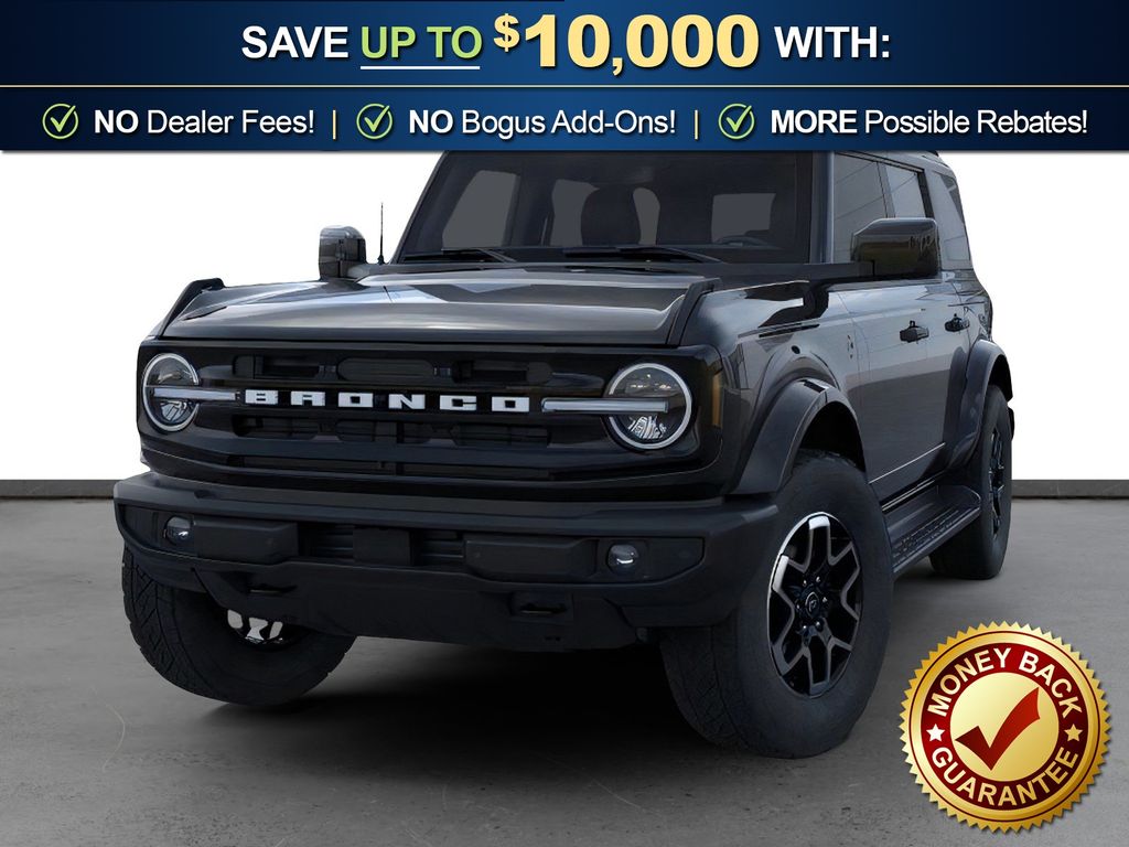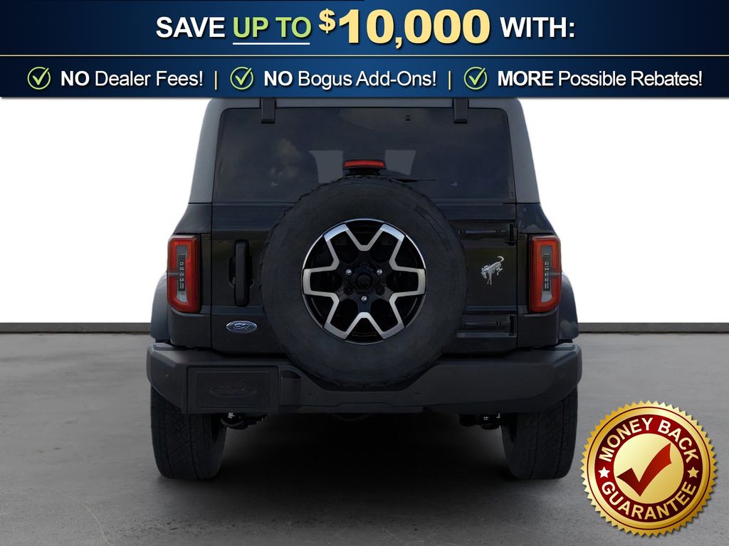 Shadow Black 2026 Ford Bronco Outer Banks NFT 4WD 10-Speed Automatic 2.7L EcoBoost V6 18" Bright Machined Aluminum Wheels, 3.73 Axle Ratio, 4-Wheel Disc Brakes, 7 Speakers, ABS brakes, Air Conditioning, Alloy wheels, AM/FM radio: SiriusXM with 360L, AM/FM Stereo, Auto High-beam Headlights, Auto-dimming Rear-View mirror, Automatic temperature control, Brake assist, Carbonized Gray Molded-in-Color Hard Top, Compass, Connected Navigation, Delay-off headlights, Driver door bin, Driver vanity mirror, Dual front impact airbags, Dual front side impact airbags, Electronic Stability Control, Emergency communication system: 911 Assist, Exterior Parking Camera Rear, Ford Connectivity Package (1-Year Included), Front anti-roll bar, Front Bucket Seats, Front Center Armrest, Front dual zone A/C, Front fog lights, Front License Plate Bracket, Front reading lights, Front wheel independent suspension, Fully automatic headlights, Hard Top Sound Deadening Headliner, Heated door mirrors, Heated front seats, Heated Leather-Trimmed/Vinyl Bucket Seats, Heated steering wheel, Illuminated entry, Integrated roll-over protection, Leather Shift Knob, Low tire pressure warning, Navigation system: Connected Navigation, Occupant sensing airbag, Outside temperature display, Overhead airbag, Overhead console, Panic alarm, Passenger door bin, Passenger vanity mirror, Power door mirrors, Power driver seat, Power passenger seat, Power steering, Power windows, Radio data system, Rear seat center armrest, Rear-Window Defroster and Washer, Remote keyless entry, Security system, SiriusXM with 360L, Speed control, Split folding rear seat, Steering wheel mounted audio controls, SYNC 4, Tachometer, Telescoping steering wheel, Tilt steering wheel, Traction control, Trip computer, Variably intermittent wipers, Voltmeter.