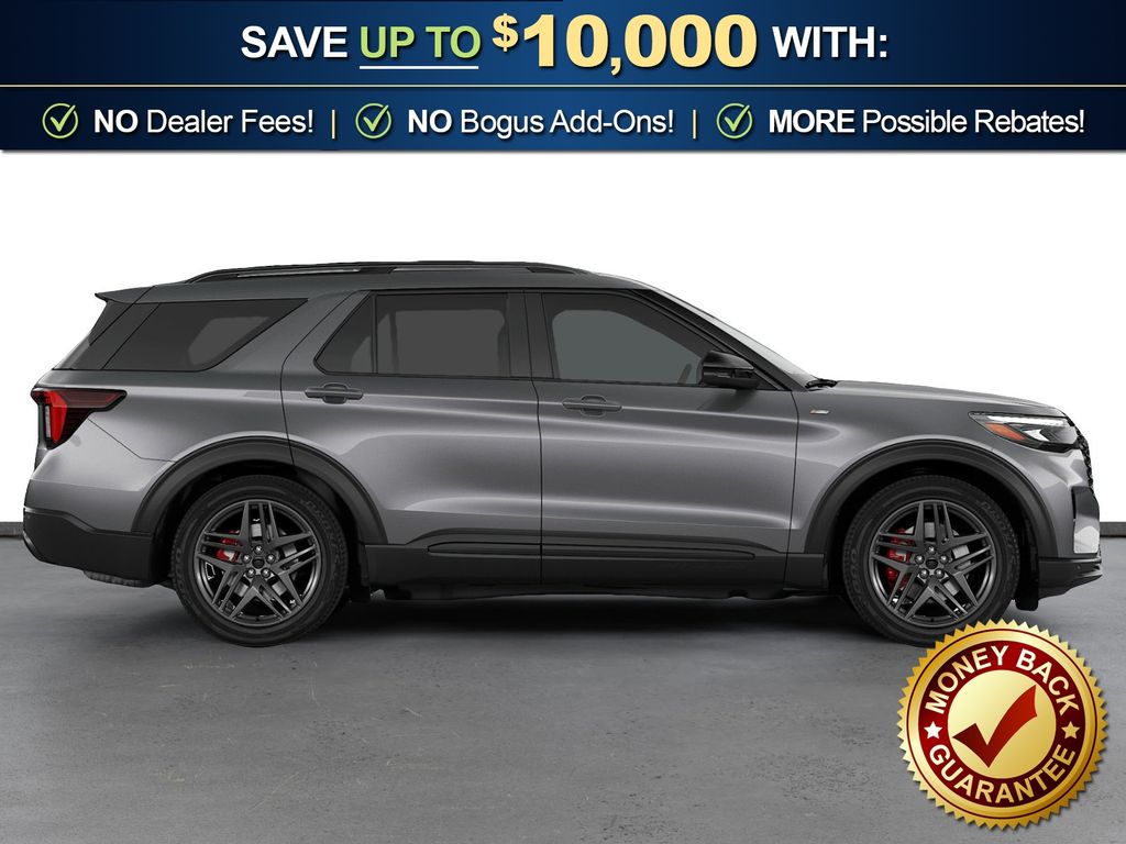 Carbonized Gray Metallic 2026 Ford Explorer ST-Line NFT 4WD 10-Speed Automatic 2.3L EcoBoost I-4 4WD, 10 Speakers, 110V/150W AC Power Outlet, 2nd Row Captain's Chairs w/E-Z Entry and Armrest, 2nd Row Heated Seats, 3rd row seats: bench, 4-Wheel Disc Brakes, ABS brakes, Air Conditioning, Alloy wheels, AM/FM radio: SiriusXM with 360L, Ambient Lighting, Apple CarPlay/Android Auto, Auto High-beam Headlights, Auto-Dimming Interior Rear-View Mirror, Automatic temperature control, Brake assist, Bumpers: body-color, Compass, Delay-off headlights, Driver door bin, Driver vanity mirror, Dual front impact airbags, Dual front side impact airbags, Electronic Stability Control, Emergency communication system: 911 Assist, Exterior Parking Camera Rear, Four wheel independent suspension, Front anti-roll bar, Front Bucket Seats, Front Center Armrest, Front dual zone A/C, Front fog lights, Front License Plate Bracket, Front reading lights, Fully automatic headlights, Garage door transmitter, Heated door mirrors, Heated front seats, Heated steering wheel, Heated Unique Cloth Captain's Chairs, Illuminated entry, Knee airbag, Leather steering wheel, Low tire pressure warning, Manual-Folding Sideview Mirrors, Memory Driver's Seat, Navigation System, Occupant sensing airbag, Outside temperature display, Overhead airbag, Overhead console, Panic alarm, Panoramic Fixed Glass Roof with Power Shade, Passenger door bin, Passenger vanity mirror, Performance Brakes, Power door mirrors, Power driver seat, Power Liftgate, Power passenger seat, Power steering, Power windows, Premium Package, Radio: B&O Sound System by Bang and Olufsen, Rain-Sensing Wipers (front Only), Rear air conditioning, Rear anti-roll bar, Rear reading lights, Rear window defroster, Rear window wiper, Red Painted Performance Front and Rear Brake Calipers, Remote keyless entry, SecuriCode Keyless Entry Keypad, Security system, Speed control, Speed-sensing steering, Speed-Sensitive Wipers, Split folding rear seat, Spoiler, ST-Line Street Pack, Steering wheel mounted audio controls, Tachometer, Telescoping steering wheel, Tilt steering wheel, Traction control, Trip computer, Variably intermittent wipers, Wheels: 20" Ebony-Painted Machined Aluminum, Wheels: 21" Magnetite-Painted Aluminum, 4WD.