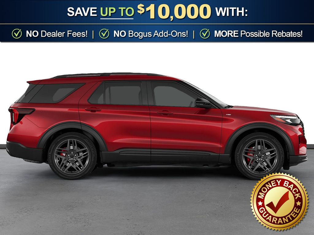 Rapid Red Metallic Tinted Clearcoat 2026 Ford Explorer ST-Line NFT RWD 10-Speed Automatic 2.3L EcoBoost I-4 10 Speakers, 110V/150W AC Power Outlet, 2nd Row Captain's Chairs w/E-Z Entry and Armrest, 2nd Row Heated Seats, 3rd row seats: bench, 4-Wheel Disc Brakes, ABS brakes, Air Conditioning, Alloy wheels, AM/FM radio: SiriusXM with 360L, Ambient Lighting, Apple CarPlay/Android Auto, Auto High-beam Headlights, Auto-Dimming Interior Rear-View Mirror, Automatic temperature control, BlueCruise (equipment + 1-Year + 90-Day Plan), BlueCruise Hardware, Brake assist, Bumpers: body-color, Compass, Delay-off headlights, Driver door bin, Driver vanity mirror, Dual front impact airbags, Dual front side impact airbags, Electronic Stability Control, Emergency communication system: 911 Assist, Exterior Parking Camera Rear, Four wheel independent suspension, Front anti-roll bar, Front Bucket Seats, Front Center Armrest, Front dual zone A/C, Front fog lights, Front License Plate Bracket, Front reading lights, Fully automatic headlights, Garage door transmitter, Heated door mirrors, Heated front seats, Heated steering wheel, Heated Unique Cloth Captain's Chairs, Illuminated entry, Knee airbag, Leather steering wheel, Low tire pressure warning, Manual-Folding Sideview Mirrors, Memory Driver's Seat, Navigation System, Occupant sensing airbag, Outside temperature display, Overhead airbag, Overhead console, Panic alarm, Passenger door bin, Passenger vanity mirror, Performance Brakes, Power door mirrors, Power driver seat, Power Liftgate, Power passenger seat, Power steering, Power windows, Premium Package, Radio: B&O Sound System by Bang and Olufsen, Rain-Sensing Wipers (front Only), Rear air conditioning, Rear anti-roll bar, Rear reading lights, Rear window defroster, Rear window wiper, Red Painted Performance Front and Rear Brake Calipers, Remote keyless entry, SecuriCode Keyless Entry Keypad, Security system, Speed control, Speed-sensing steering, Speed-Sensitive Wipers, Split folding rear seat, Spoiler, ST-Line Street Pack, Steering wheel mounted audio controls, Tachometer, Telescoping steering wheel, Tilt steering wheel, Traction control, Trip computer, Variably intermittent wipers, Wheels: 20" Ebony-Painted Machined Aluminum, Wheels: 21" Magnetite-Painted Aluminum.