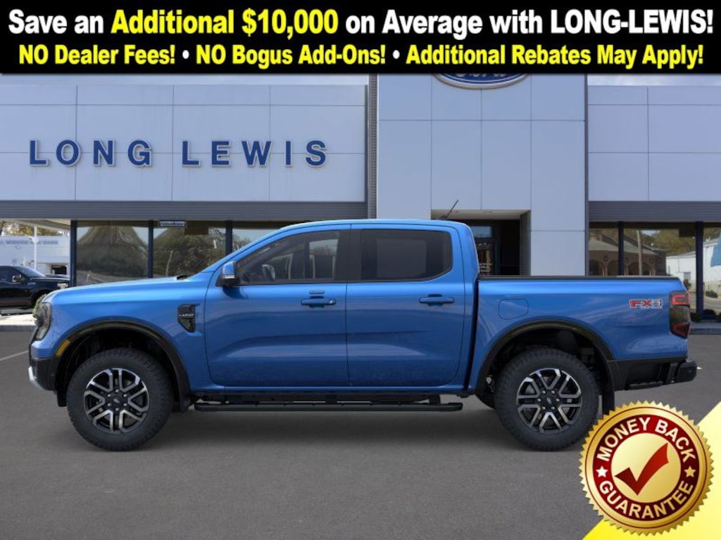 Velocity Blue Metallic 2024 Ford Ranger Lariat 4WD 10-Speed Automatic EcoBoost 2.3L I4 GTDi DOHC Turbocharged VCT 4WD, 10 Speakers, 3.73 Axle Ratio, 4-Wheel Disc Brakes, ABS brakes, Air Conditioning, Alloy wheels, AM/FM radio: SiriusXM, Auto High-beam Headlights, Auto-dimming Rear-View mirror, Automatic temperature control, Black Running Boards, Body-Color SecuriCode Keyless Entry Keypad, Brake assist, Class IV Trailer Hitch Receiver, Compass, Delay-off headlights, Driver door bin, Driver vanity mirror, Dual front impact airbags, Dual front side impact airbags, Electronic Stability Control, Electronic-Locking Rear Differential, Emergency communication system: SYNC 4 911 Assist, Equipment Group 500A Standard, Exterior Parking Camera Rear, Front & Rear Splash Guards/Mud Flaps, Front anti-roll bar, Front Bucket Seats, Front Center Armrest, Front dual zone A/C, Front fog lights, Front reading lights, Front wheel independent suspension, Fully automatic headlights, FX4 Off-Road Box Decal, FX4 Off-Road Package, FX4 Selectable Drive Modes, Garage door transmitter, Gray Painted Center Bar & Grille Surround, Gray Painted Front Fascia & Rear Bumper, Gray Painted Wheel Lip Molding, Heated door mirrors, Heated front seats, Heated steering wheel, Illuminated entry, Integrated Box Side Step, Leather Shift Knob, Leather steering wheel, Leather-Trimmed Front Heated Bucket Seats, Low tire pressure warning, Memory seat, Navigation system: Connected Navigation, Occupant sensing airbag, Off-Road Screen in Center Stack, Off-Road Tuned Shocks, Outside temperature display, Overhead airbag, Overhead console, Panic alarm, Passenger door bin, Passenger vanity mirror, Power door mirrors, Power driver seat, Power passenger seat, Power steering, Power windows, Radio: B&O Sound System by Bang & Olufsen, Rain sensing wipers, Rear reading lights, Rear seat center armrest, Rear step bumper, Rear window defroster, Remote keyless entry, Security system, SiriusXM Satellite Radio, Speed control, Speed-sensing steering, Sport Appearance Package, Sport Box Decal, Steering wheel mounted audio controls, SYNC 4A w/Connected Built-In Navigation, Telescoping steering wheel, Tilt steering wheel, Traction control, Trailer Tow Package, Trip computer, Turn signal indicator mirrors, Variably intermittent wipers, Voltmeter, Wheels: 18" Machined Aluminum w/Dark Pockets, 4WD.