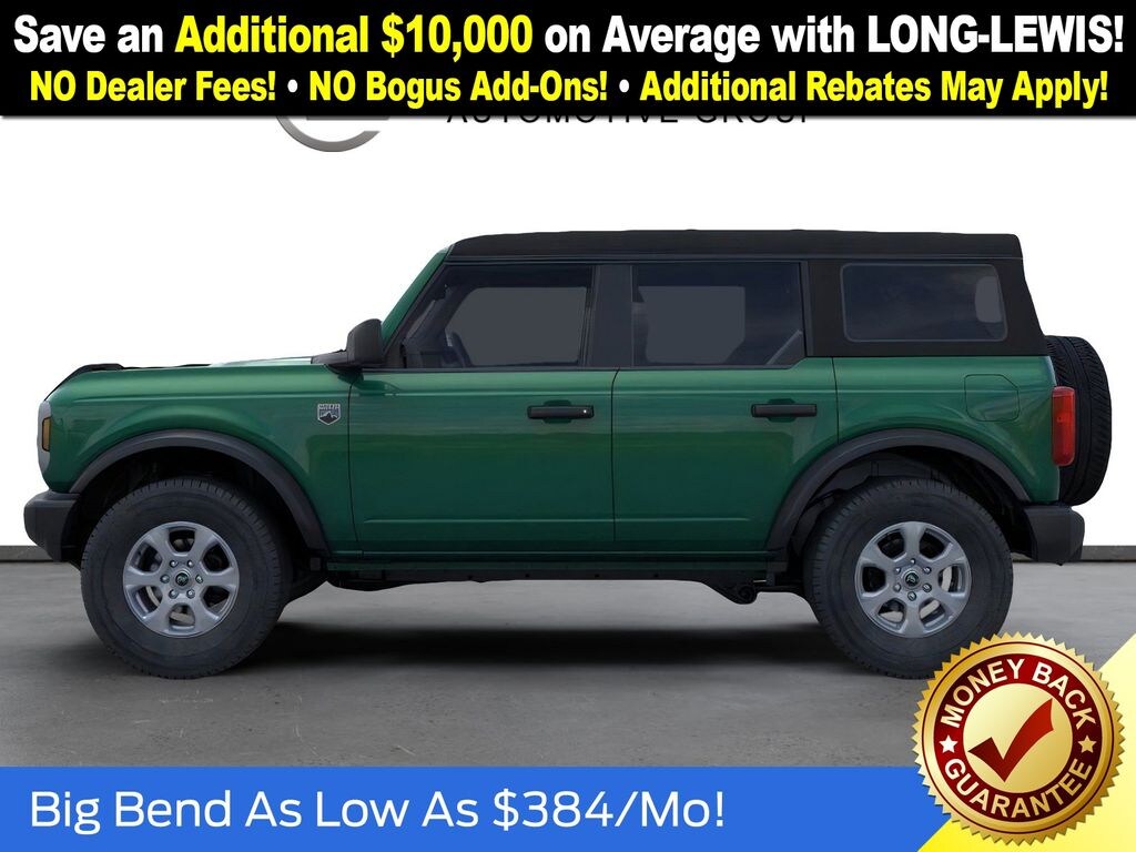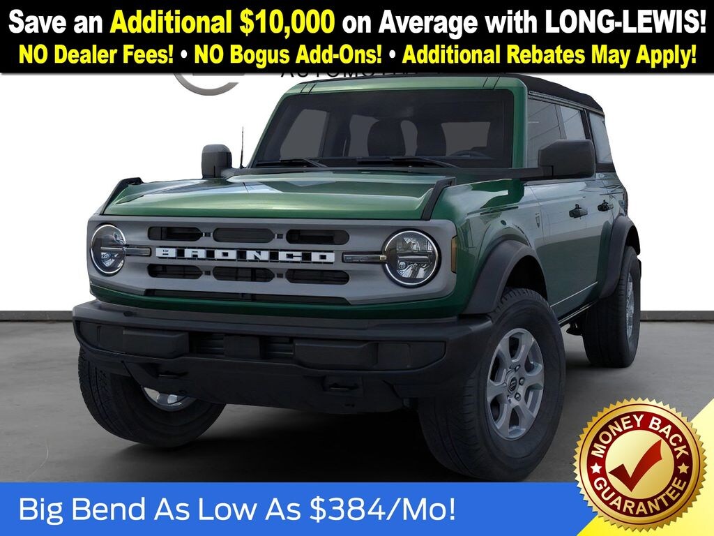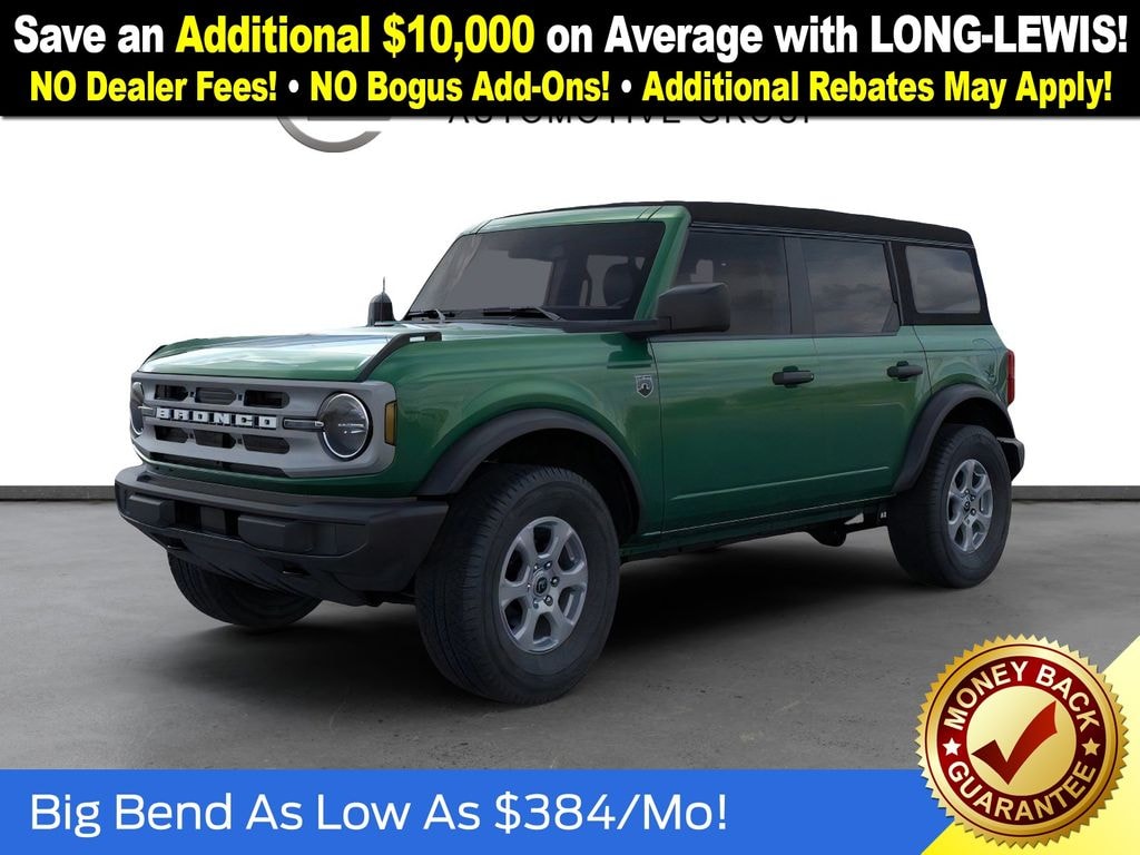 New Price! Eruption Green Metallic 2025 Ford Bronco Big Bend FCT 4WD 7-Speed Manual 2.3L EcoBoost I-4 4-Wheel Disc Brakes, 4.46 Axle Ratio, 7 Speakers, ABS brakes, Air Conditioning, Alloy wheels, AM/FM radio: SiriusXM with 360L, AM/FM Stereo, Auto High-beam Headlights, Brake assist, Cloth Bucket Seats, Compass, Delay-off headlights, Driver door bin, Driver vanity mirror, Dual front impact airbags, Dual front side impact airbags, Electronic Stability Control, Emergency communication system: 911 Assist, Exterior Parking Camera Rear, Front anti-roll bar, Front Bucket Seats, Front Center Armrest, Front License Plate Bracket, Front reading lights, Front wheel independent suspension, Fully automatic headlights, Heated door mirrors, Illuminated entry, Integrated roll-over protection, Internet access capable: FordPass Connect, Leather Shift Knob, Low tire pressure warning, Occupant sensing airbag, Outside temperature display, Overhead airbag, Overhead console, Panic alarm, Passenger door bin, Passenger vanity mirror, Power door mirrors, Power steering, Power windows, Radio data system, Remote keyless entry, Security system, SiriusXM w/360L, Speed control, Split folding rear seat, Steering wheel mounted audio controls, SYNC 4, Tachometer, Telescoping steering wheel, Tilt steering wheel, Traction control, Trip computer, Variably intermittent wipers, Wheels: 17" Carbonized Gray-Painted Aluminum.