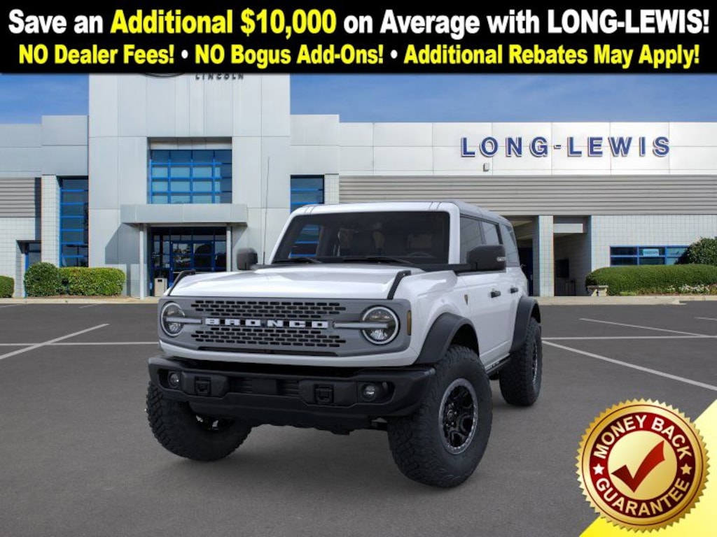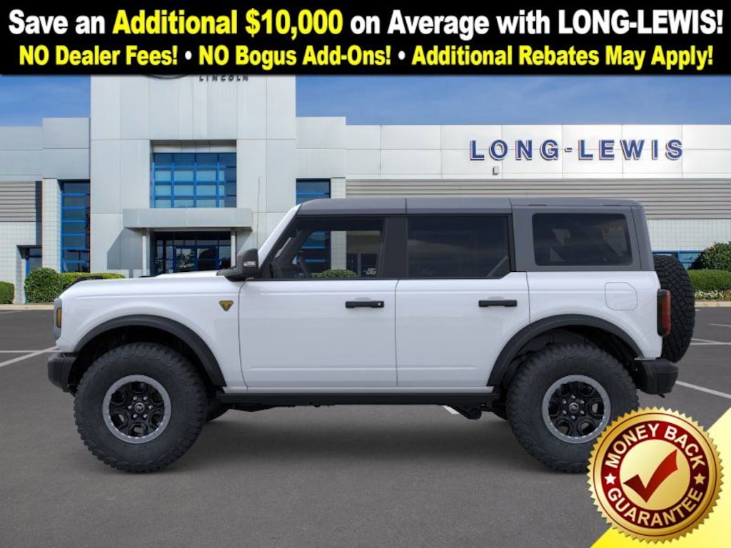 Dealer Discount of $2,455 off MSRP Oxford White 2025 Ford Bronco Badlands fctp 4WD 10-Speed Automatic 2.7L EcoBoost V6 4-Wheel Disc Brakes, 4.7 Axle Ratio, 4.7 Final Drive Ratio, 7 Speakers, ABS brakes, Air Conditioning, Alloy wheels, AM/FM radio: SiriusXM with 360L, AM/FM Stereo, Auto High-beam Headlights, Auto-dimming Rear-View mirror, Brake assist, Carbonized Gray Molded-In-Color Hard Top, Compass, Connected Navigation, Delay-off headlights, Driver door bin, Driver vanity mirror, Dual front impact airbags, Dual front side impact airbags, Electronic Stability Control, Emergency communication system: 911 Assist, Exterior Parking Camera Rear, Front anti-roll bar, Front Bucket Seats, Front Center Armrest, Front fog lights, Front License Plate Bracket, Front reading lights, Front wheel independent suspension, Fully automatic headlights, Hard Top Sound Deadening Headliner, Heated door mirrors, Heated front seats, Heated steering wheel, High Clearance Fender Flares, High Clearance Suspension, Illuminated entry, Integrated roll-over protection, Leather Shift Knob, Low tire pressure warning, Marine Grade Vinyl Heated Bucket Seats, Occupant sensing airbag, Outside temperature display, Overhead airbag, Overhead console, Panic alarm, Passenger door bin, Passenger vanity mirror, Position-Sensitive Bilstein Shock Absorbers, Power door mirrors, Power steering, Power windows, Radio data system, Rear-Window Defroster & Washer, Remote keyless entry, Sasquatch Package, Security system, SiriusXM w/360L, Speed control, Split folding rear seat, Steering wheel mounted audio controls, SYNC 4, Tachometer, Telescoping steering wheel, Tilt steering wheel, Traction control, Trip computer, Variably intermittent wipers, Voltmeter, Wheels: 17" Black High Gloss-Painted Aluminum (64X). Price includes: $1000 - Final Days Mega Bonus Cash. Exp. 01/02/2026 $2000 - Retail Bonus Cash. Exp. 01/05/2026