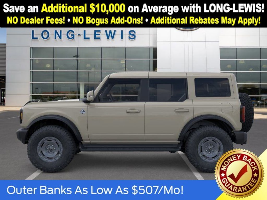 Dealer Discount of $2,487 off MSRP Desert Sand 2025 Ford Bronco Outer Banks NFT 4WD 10-Speed Automatic 2.7L EcoBoost V6 18" Bright Machined Aluminum Wheels, 3.73 Axle Ratio, 4-Wheel Disc Brakes, 7 Speakers, ABS brakes, Air Conditioning, Alloy wheels, AM/FM radio: SiriusXM with 360L, AM/FM Stereo, Auto High-beam Headlights, Auto-dimming Rear-View mirror, Automatic temperature control, Brake assist, Compass, Connected Navigation, Delay-off headlights, Driver door bin, Driver vanity mirror, Dual front impact airbags, Dual front side impact airbags, Electronic Stability Control, Emergency communication system: 911 Assist, Exterior Parking Camera Rear, Front anti-roll bar, Front Bucket Seats, Front Center Armrest, Front dual zone A/C, Front fog lights, Front reading lights, Front wheel independent suspension, Fully automatic headlights, Heated door mirrors, Heated front seats, Heated Leather-Trimmed/Vinyl Bucket Seats, Heated steering wheel, Illuminated entry, Integrated roll-over protection, Internet access capable: FordPass Connect, Leather Shift Knob, Low tire pressure warning, Navigation system: Connected Navigation, Occupant sensing airbag, Outside temperature display, Overhead airbag, Overhead console, Panic alarm, Passenger door bin, Passenger vanity mirror, Power door mirrors, Power driver seat, Power passenger seat, Power steering, Power windows, Radio data system, Rear seat center armrest, Remote keyless entry, Security system, SiriusXM w/360L, Speed control, Split folding rear seat, Steering wheel mounted audio controls, SYNC 4, Tachometer, Telescoping steering wheel, Tilt steering wheel, Traction control, Trip computer, Variably intermittent wipers, Voltmeter. Price includes: $2500 - Retail Customer Cash. Exp. 03/31/2026