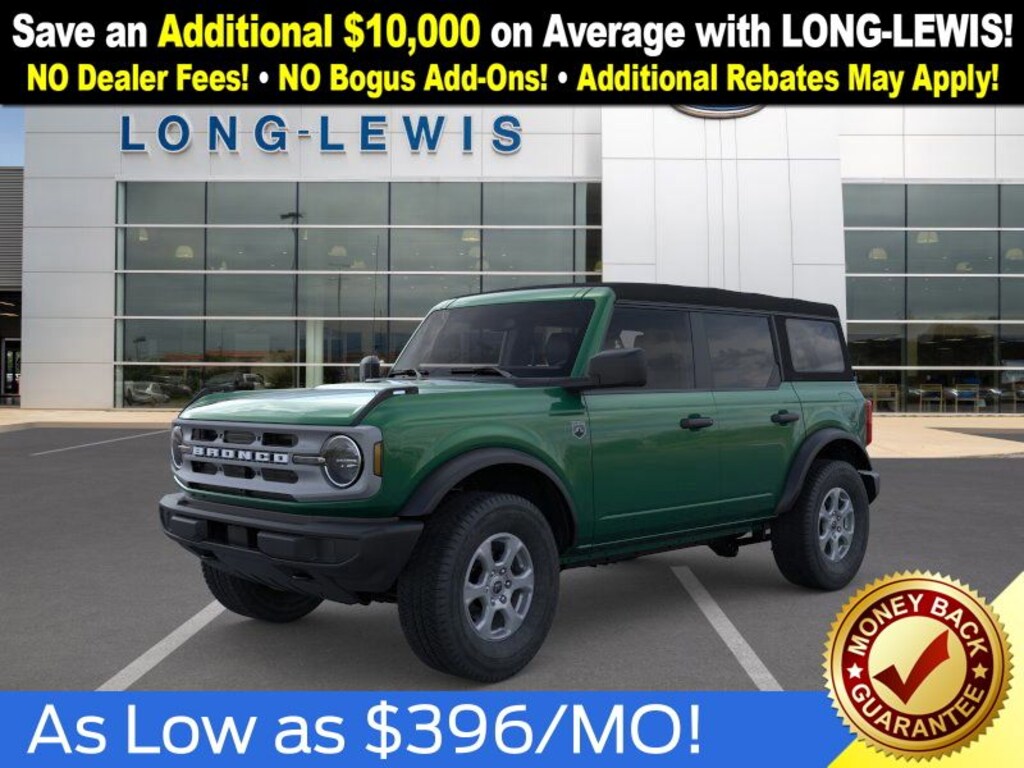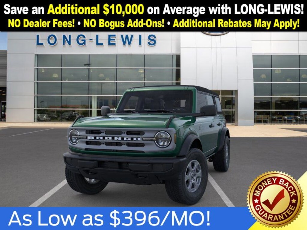 Eruption Green Metallic 2025 Ford Bronco Big Bend NFT 4WD 10-Speed Automatic 2.3L EcoBoost I-4 4-Wheel Disc Brakes, 4.46 Axle Ratio, 7 Speakers, ABS brakes, Air Conditioning, Alloy wheels, AM/FM radio: SiriusXM with 360L, AM/FM Stereo, Auto High-beam Headlights, Brake assist, Cloth Bucket Seats, Compass, Delay-off headlights, Driver door bin, Driver vanity mirror, Dual front impact airbags, Dual front side impact airbags, Electronic Stability Control, Emergency communication system: 911 Assist, Exterior Parking Camera Rear, Front anti-roll bar, Front Bucket Seats, Front Center Armrest, Front reading lights, Front wheel independent suspension, Fully automatic headlights, Heated door mirrors, Illuminated entry, Integrated roll-over protection, Internet access capable: FordPass Connect, Leather Shift Knob, Low tire pressure warning, Occupant sensing airbag, Outside temperature display, Overhead airbag, Overhead console, Panic alarm, Passenger door bin, Passenger vanity mirror, Power door mirrors, Power steering, Power windows, Radio data system, Remote keyless entry, Security system, SiriusXM w/360L, Speed control, Split folding rear seat, Steering wheel mounted audio controls, SYNC 4, Tachometer, Telescoping steering wheel, Tilt steering wheel, Traction control, Trip computer, Variably intermittent wipers, Wheels: 17" Carbonized Gray-Painted Aluminum.