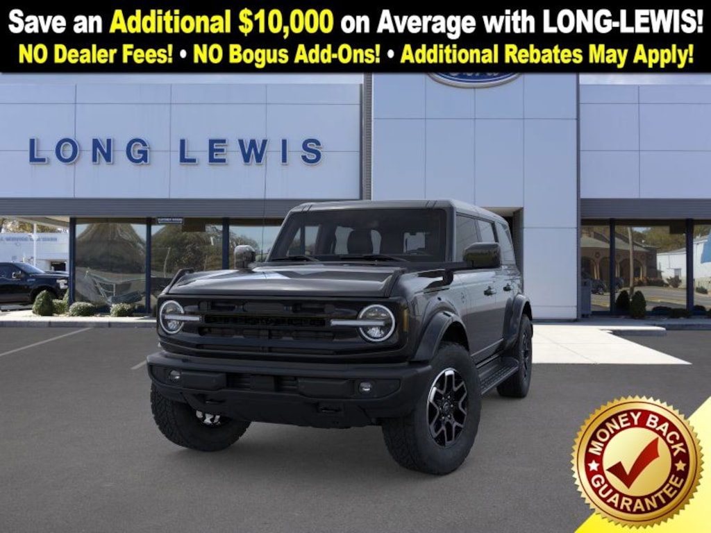 Shadow Black 2025 Ford Bronco Outer Banks 4WD 10-Speed Automatic 2.3L EcoBoost I-4 18" Bright Machined Aluminum Wheels, 3.73 Axle Ratio, 4-Wheel Disc Brakes, 7 Speakers, ABS brakes, Air Conditioning, Alloy wheels, AM/FM radio: SiriusXM with 360L, AM/FM Stereo, Auto High-beam Headlights, Auto-dimming Rear-View mirror, Automatic temperature control, Brake assist, Carbonized Gray Molded-In-Color Hard Top, Compass, Connected Navigation, Delay-off headlights, Driver door bin, Driver vanity mirror, Dual front impact airbags, Dual front side impact airbags, Electronic Stability Control, Emergency communication system: 911 Assist, Exterior Parking Camera Rear, Front anti-roll bar, Front Bucket Seats, Front Center Armrest, Front dual zone A/C, Front fog lights, Front License Plate Bracket, Front reading lights, Front wheel independent suspension, Fully automatic headlights, Hard Top Sound Deadening Headliner, Heated door mirrors, Heated front seats, Heated Leather-Trimmed/Vinyl Bucket Seats, Heated steering wheel, Illuminated entry, Integrated roll-over protection, Leather Shift Knob, Low tire pressure warning, Navigation system: Connected Navigation, Occupant sensing airbag, Outside temperature display, Overhead airbag, Overhead console, Panic alarm, Passenger door bin, Passenger vanity mirror, Power door mirrors, Power driver seat, Power passenger seat, Power steering, Power windows, Radio data system, Rear seat center armrest, Rear-Window Defroster & Washer, Remote keyless entry, Security system, SiriusXM w/360L, Speed control, Split folding rear seat, Steering wheel mounted audio controls, SYNC 4, Tachometer, Telescoping steering wheel, Tilt steering wheel, Traction control, Trip computer, Variably intermittent wipers, Voltmeter.