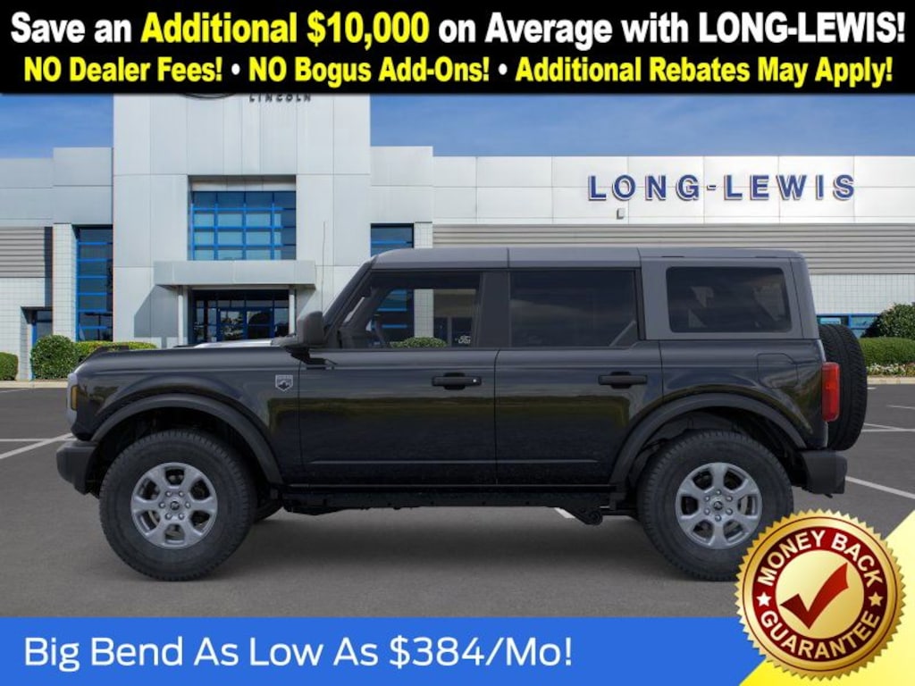 Dealer Discount of $1,260 off MSRP Shadow Black 2025 Ford Bronco Big Bend NFT 4WD 2.3L EcoBoost I-4 4-Wheel Disc Brakes, 4.46 Axle Ratio, 7 Speakers, ABS brakes, Air Conditioning, Alloy wheels, AM/FM radio: SiriusXM with 360L, AM/FM Stereo, Auto High-beam Headlights, Brake assist, Cloth Bucket Seats, Compass, Delay-off headlights, Driver door bin, Driver vanity mirror, Dual front impact airbags, Dual front side impact airbags, Electronic Stability Control, Emergency communication system: 911 Assist, Exterior Parking Camera Rear, Front anti-roll bar, Front Bucket Seats, Front Center Armrest, Front reading lights, Front wheel independent suspension, Fully automatic headlights, Heated door mirrors, Illuminated entry, Integrated roll-over protection, Internet access capable: FordPass Connect, Leather Shift Knob, Low tire pressure warning, Occupant sensing airbag, Outside temperature display, Overhead airbag, Overhead console, Panic alarm, Passenger door bin, Passenger vanity mirror, Power door mirrors, Power steering, Power windows, Radio data system, Remote keyless entry, Security system, SiriusXM w/360L, Speed control, Split folding rear seat, Steering wheel mounted audio controls, SYNC 4, Tachometer, Telescoping steering wheel, Tilt steering wheel, Traction control, Trip computer, Variably intermittent wipers, Wheels: 17" Carbonized Gray-Painted Aluminum.