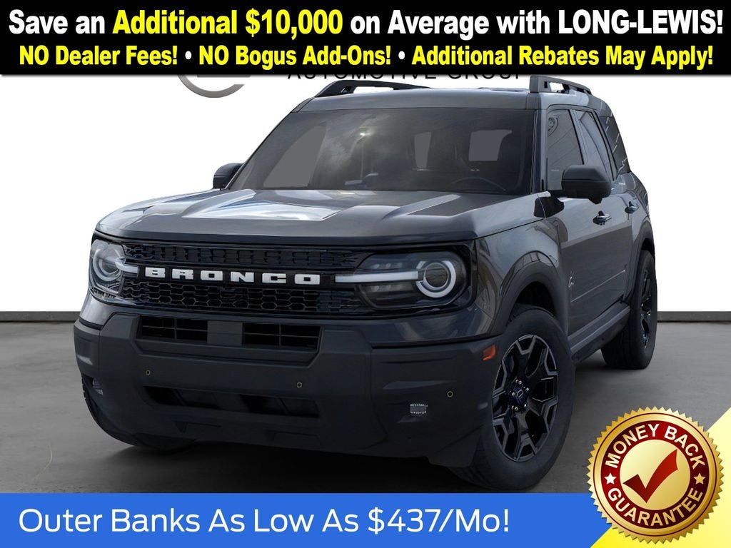 Shadow Black 2025 Ford Bronco Sport Outer Banks FCT 4WD 8-Speed Automatic 1.5L EcoBoost 360-Degree Camera w/Trail & Split View, 4-Wheel Disc Brakes, 6 Speakers, ABS brakes, Air Conditioning, Alloy wheels, AM/FM radio: SiriusXM, AM/FM Stereo, Auto High-beam Headlights, Auto-dimming Rear-View mirror, Automatic temperature control, B&O Sound System by Bang & Olufsen, Brake assist, Compass, Connected Navigation, Delay-off headlights, Driver door bin, Driver vanity mirror, Dual front impact airbags, Dual front side impact airbags, Electronic Stability Control, Emergency communication system: SYNC 4 911 Assist, Four wheel independent suspension, Front anti-roll bar, Front Bucket Seats, Front Center Armrest, Front Driver/Passenger Seat Back Map Pockets, Front dual zone A/C, Front fog lights, Front License Plate Bracket, Front Parking Sensors, Front reading lights, Fully automatic headlights, Garage door transmitter, HD Radio, Heated door mirrors, Heated front seats, Heated steering wheel, Illuminated entry, Knee airbag, Low tire pressure warning, Memory seat, Occupant sensing airbag, Outer Banks Tech Package+, Outside temperature display, Overhead airbag, Overhead console, Panic alarm, Passenger door bin, Passenger vanity mirror, Power door mirrors, Power driver seat, Power passenger seat, Power steering, Power windows, Premium Trimmed Front Bucket Seats w/Ebony/Roast, Radio data system, Rain sensing wipers, Rear anti-roll bar, Rear Parking Sensors, Rear reading lights, Rear seat center armrest, Rear window defroster, Rear window wiper, Remote keyless entry, Reverse Brake Assist, Security system, SiriusXM, Speed control, Speed-sensing steering, Speed-Sensitive Wipers, Split folding rear seat, Steering wheel mounted audio controls, SYNC 4 w/Enhanced Voice Recognition, Tachometer, Telescoping steering wheel, Tilt steering wheel, Traction control, Trip computer, Variably intermittent wipers, Wheels: 18" Ebony Black-Painted Aluminum.