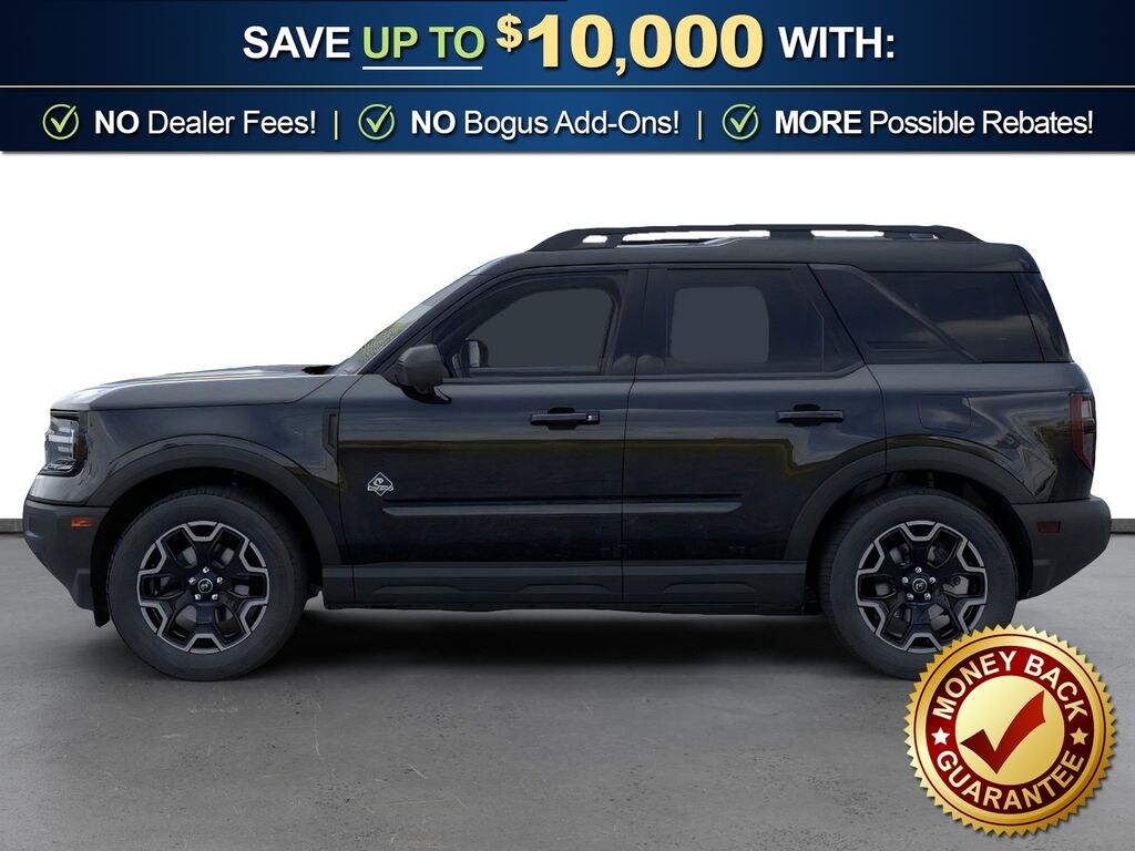 Shadow Black 2025 Ford Bronco Sport Outer Banks FCT 4WD 8-Speed Automatic 1.5L EcoBoost 360-Degree Camera w/Trail & Split View, 4-Wheel Disc Brakes, 6 Speakers, ABS brakes, Air Conditioning, Alloy wheels, AM/FM radio: SiriusXM, AM/FM Stereo, Auto High-beam Headlights, Auto-dimming Rear-View mirror, Automatic temperature control, B&O Sound System by Bang & Olufsen, Brake assist, Compass, Connected Navigation, Delay-off headlights, Driver door bin, Driver vanity mirror, Dual front impact airbags, Dual front side impact airbags, Electronic Stability Control, Emergency communication system: SYNC 4 911 Assist, Equipment Group 300A, Four wheel independent suspension, Front anti-roll bar, Front Bucket Seats, Front Center Armrest, Front Driver/Passenger Seat Back Map Pockets, Front dual zone A/C, Front fog lights, Front License Plate Bracket, Front Parking Sensors, Front reading lights, Fully automatic headlights, Garage door transmitter, HD Radio, Heated door mirrors, Heated front seats, Heated steering wheel, Illuminated entry, Knee airbag, Low tire pressure warning, Memory seat, Occupant sensing airbag, Outer Banks Tech Package+, Outside temperature display, Overhead airbag, Overhead console, Panic alarm, Passenger door bin, Passenger vanity mirror, Power door mirrors, Power driver seat, Power passenger seat, Power steering, Power windows, Premium Trimmed Front Bucket Seats w/Ebony/Roast, Radio data system, Rain sensing wipers, Rear anti-roll bar, Rear Parking Sensors, Rear reading lights, Rear seat center armrest, Rear window defroster, Rear window wiper, Remote keyless entry, Reverse Brake Assist, Security system, SiriusXM, Speed control, Speed-sensing steering, Speed-Sensitive Wipers, Split folding rear seat, Steering wheel mounted audio controls, SYNC 4 w/Enhanced Voice Recognition, Tachometer, Telescoping steering wheel, Tilt steering wheel, Traction control, Trip computer, Variably intermittent wipers, Wheels: 18" Ebony Black-Painted Aluminum.