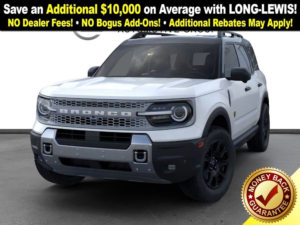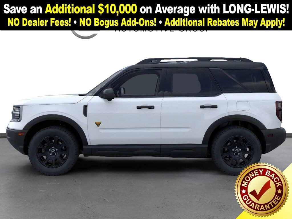 Oxford White 2025 Ford Bronco Sport Badlands fctp 4WD 8-Speed Automatic EcoBoost 2.0L I4 GTDi DOHC Turbocharged VCT 4-Wheel Disc Brakes, 6 Speakers, ABS brakes, Air Conditioning, Alloy wheels, AM/FM radio: SiriusXM, AM/FM Stereo, Auto High-beam Headlights, Auto-dimming Rear-View mirror, Automatic temperature control, B&O Sound System by Bang & Olufsen, Badlands Tech Package, Brake assist, Compass, Connected Navigation, Delay-off headlights, Driver door bin, Driver vanity mirror, Dual front impact airbags, Dual front side impact airbags, Electronic Stability Control, Emergency communication system: SYNC 4 911 Assist, Four wheel independent suspension, Front anti-roll bar, Front Bucket Seats, Front Center Armrest, Front fog lights, Front License Plate Bracket, Front reading lights, Fully automatic headlights, Garage door transmitter, HD Radio, Heated door mirrors, Heated front seats, Heated steering wheel, Illuminated entry, Knee airbag, Leather Trimmed Front Bucket Seats, Low tire pressure warning, Memory seat, Occupant sensing airbag, Outside temperature display, Overhead airbag, Overhead console, Panic alarm, Passenger door bin, Passenger vanity mirror, Power door mirrors, Power driver seat, Power passenger seat, Power steering, Power windows, Radio data system, Rear anti-roll bar, Rear reading lights, Rear seat center armrest, Rear window defroster, Rear window wiper, Remote keyless entry, Security system, SiriusXM, Speed control, Speed-sensing steering, Speed-Sensitive Wipers, Split folding rear seat, Steering wheel mounted audio controls, SYNC 4 w/Enhanced Voice Recognition, Tachometer, Telescoping steering wheel, Tilt steering wheel, Traction control, Trip computer, Variably intermittent wipers, Wheels: 17" Matte Black-Painted Aluminum.