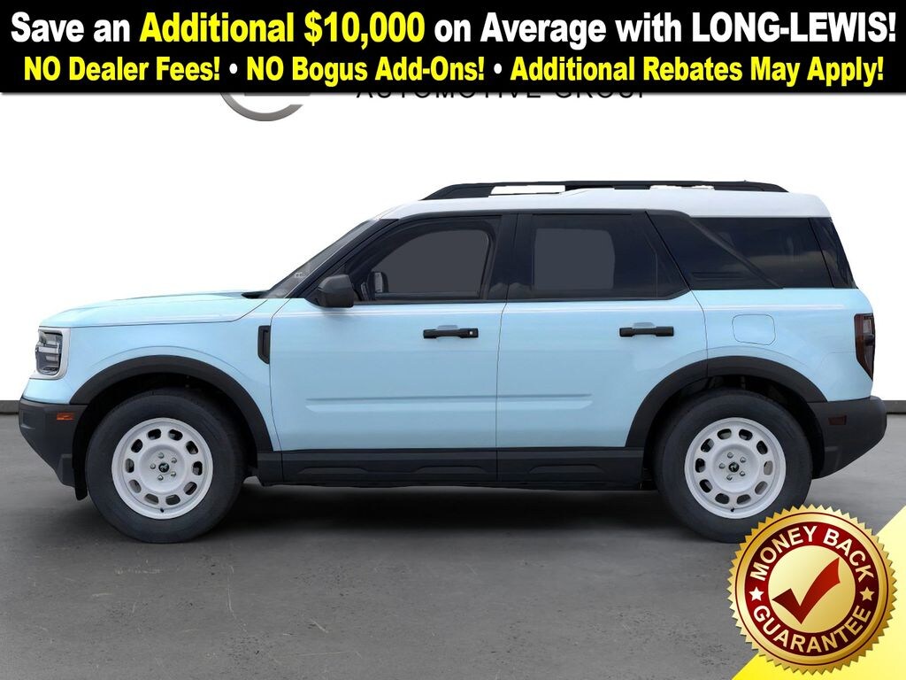 Robins Egg Blue 2025 Ford Bronco Sport Heritage FCT 4WD 8-Speed Automatic 1.5L EcoBoost 4-Wheel Disc Brakes, 6 Speakers, ABS brakes, Air Conditioning, Alloy wheels, AM/FM radio: SiriusXM, AM/FM Stereo, Auto High-beam Headlights, Automatic temperature control, Brake assist, Compass, Delay-off headlights, Driver door bin, Driver vanity mirror, Dual front impact airbags, Dual front side impact airbags, Electronic Stability Control, Emergency communication system: SYNC 4 911 Assist, Four wheel independent suspension, Front anti-roll bar, Front Bucket Seats, Front Center Armrest, Front Driver/Passenger Seat Back Map Pockets, Front License Plate Bracket, Front reading lights, Fully automatic headlights, Heated door mirrors, Illuminated entry, Knee airbag, Low tire pressure warning, Occupant sensing airbag, Outside temperature display, Overhead airbag, Overhead console, Panic alarm, Passenger door bin, Passenger vanity mirror, Plaid Cloth Front Bucket Seats, Power door mirrors, Power steering, Power windows, Radio data system, Rear anti-roll bar, Rear Parking Sensors, Rear reading lights, Rear seat center armrest, Rear window defroster, Rear window wiper, Remote keyless entry, Security system, SiriusXM, Speed control, Speed-sensing steering, Speed-Sensitive Wipers, Split folding rear seat, Steering wheel mounted audio controls, SYNC 4 w/Enhanced Voice Recognition, Tachometer, Telescoping steering wheel, Tilt steering wheel, Traction control, Trip computer, Variably intermittent wipers, Wheels: 17" Oxford White-Painted Aluminum.