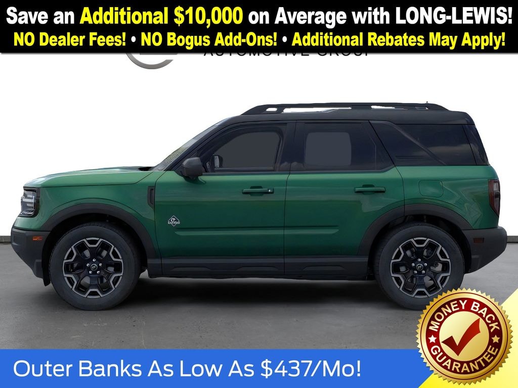 Dealer Discount of $2,159 off MSRP Eruption Green Metallic 2025 Ford Bronco Sport Outer Banks NFT 4WD 8-Speed Automatic 1.5L EcoBoost 360-Degree Camera w/Trail & Split View, 4-Wheel Disc Brakes, 6 Speakers, ABS brakes, Air Conditioning, Alloy wheels, AM/FM radio: SiriusXM, AM/FM Stereo, Auto High-beam Headlights, Auto-dimming Rear-View mirror, Automatic temperature control, B&O Sound System by Bang & Olufsen, Brake assist, Compass, Connected Navigation, Delay-off headlights, Driver door bin, Driver vanity mirror, Dual front impact airbags, Dual front side impact airbags, Electronic Stability Control, Emergency communication system: SYNC 4 911 Assist, Four wheel independent suspension, Front anti-roll bar, Front Bucket Seats, Front Center Armrest, Front Driver/Passenger Seat Back Map Pockets, Front dual zone A/C, Front fog lights, Front License Plate Bracket, Front Parking Sensors, Front reading lights, Fully automatic headlights, Garage door transmitter, HD Radio, Heated door mirrors, Heated front seats, Heated steering wheel, Illuminated entry, Knee airbag, Low tire pressure warning, Memory seat, Occupant sensing airbag, Outer Banks Tech Package+, Outside temperature display, Overhead airbag, Overhead console, Panic alarm, Passenger door bin, Passenger vanity mirror, Power door mirrors, Power driver seat, Power passenger seat, Power steering, Power windows, Premium Trimmed Front Bucket Seats w/Ebony/Roast, Radio data system, Rain sensing wipers, Rear anti-roll bar, Rear Parking Sensors, Rear reading lights, Rear seat center armrest, Rear window defroster, Rear window wiper, Remote keyless entry, Reverse Brake Assist, Security system, SiriusXM, Speed control, Speed-sensing steering, Speed-Sensitive Wipers, Split folding rear seat, Steering wheel mounted audio controls, SYNC 4 w/Enhanced Voice Recognition, Tachometer, Telescoping steering wheel, Tilt steering wheel, Traction control, Trip computer, Variably intermittent wipers, Wheels: 18" Ebony Black-Painted Aluminum.