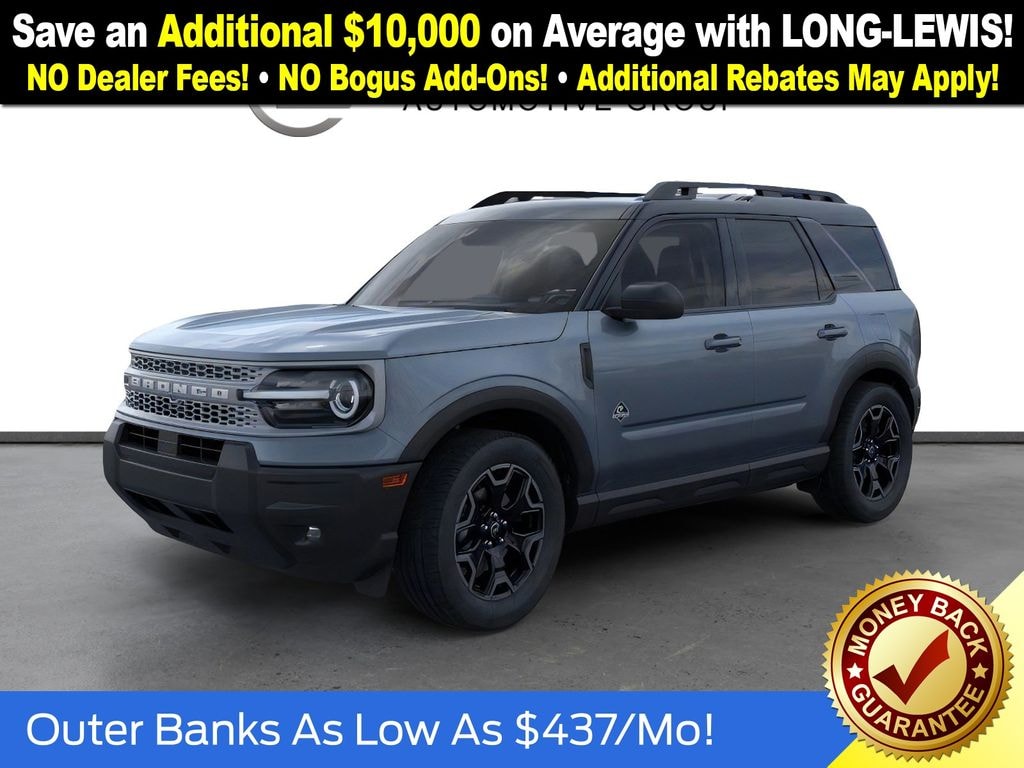 Azure Gray Metallic Tri-Coat 2025 Ford Bronco Sport Outer Banks NFT 4WD 8-Speed Automatic 1.5L EcoBoost 4-Wheel Disc Brakes, 6 Speakers, ABS brakes, Air Conditioning, Alloy wheels, AM/FM radio: SiriusXM, AM/FM Stereo, Auto High-beam Headlights, Auto-dimming Rear-View mirror, Automatic temperature control, Brake assist, Compass, Delay-off headlights, Driver door bin, Driver vanity mirror, Dual front impact airbags, Dual front side impact airbags, Electronic Stability Control, Emergency communication system: SYNC 4 911 Assist, Four wheel independent suspension, Front anti-roll bar, Front Bucket Seats, Front Center Armrest, Front Driver/Passenger Seat Back Map Pockets, Front dual zone A/C, Front fog lights, Front License Plate Bracket, Front reading lights, Fully automatic headlights, Garage door transmitter, Heated door mirrors, Heated front seats, Heated steering wheel, Illuminated entry, Knee airbag, Low tire pressure warning, Memory seat, Occupant sensing airbag, Outside temperature display, Overhead airbag, Overhead console, Panic alarm, Passenger door bin, Passenger vanity mirror, Power door mirrors, Power driver seat, Power passenger seat, Power steering, Power windows, Premium Trimmed Front Bucket Seats w/Ebony/Roast, Radio data system, Rain sensing wipers, Rear anti-roll bar, Rear Parking Sensors, Rear reading lights, Rear seat center armrest, Rear window defroster, Rear window wiper, Remote keyless entry, Security system, SiriusXM, Speed control, Speed-sensing steering, Speed-Sensitive Wipers, Split folding rear seat, Steering wheel mounted audio controls, SYNC 4 w/Enhanced Voice Recognition, Tachometer, Telescoping steering wheel, Tilt steering wheel, Traction control, Trip computer, Variably intermittent wipers, Wheels: 18" Ebony Black-Painted Aluminum.
