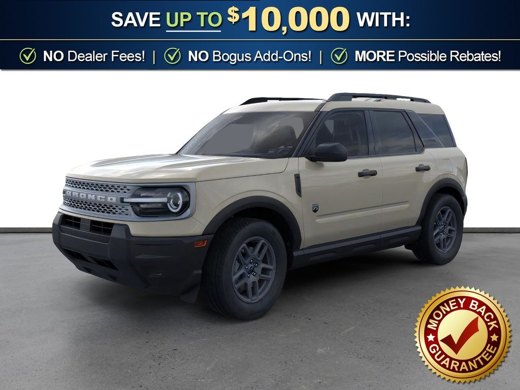 Desert Sand 2025 Ford Bronco Sport Big Bend FCT 4WD 8-Speed Automatic 1.5L EcoBoost 4-Wheel Disc Brakes, 6 Speakers, ABS brakes, Air Conditioning, Alloy wheels, AM/FM radio: SiriusXM, AM/FM Stereo, Auto High-beam Headlights, Automatic temperature control, Brake assist, Cloth w/Easy-to-Clean Front Bucket Seats, Compass, Delay-off headlights, Driver door bin, Driver vanity mirror, Dual front impact airbags, Dual front side impact airbags, Electronic Stability Control, Emergency communication system: SYNC 4 911 Assist, Four wheel independent suspension, Front anti-roll bar, Front Bucket Seats, Front Center Armrest, Front License Plate Bracket, Front reading lights, Fully automatic headlights, Heated door mirrors, Illuminated entry, Knee airbag, Low tire pressure warning, Occupant sensing airbag, Outside temperature display, Overhead airbag, Overhead console, Panic alarm, Passenger door bin, Passenger vanity mirror, Power door mirrors, Power steering, Power windows, Radio data system, Rear anti-roll bar, Rear Parking Sensors, Rear reading lights, Rear seat center armrest, Rear window defroster, Rear window wiper, Remote keyless entry, Security system, SiriusXM, Speed control, Speed-sensing steering, Speed-Sensitive Wipers, Split folding rear seat, Steering wheel mounted audio controls, SYNC 4 w/Enhanced Voice Recognition, Tachometer, Telescoping steering wheel, Tilt steering wheel, Traction control, Trip computer, Variably intermittent wipers, Wheels: 17" Carbonized Gray Painted Aluminum, Wheels: 17" Carbonized Gray-Painted Aluminum.