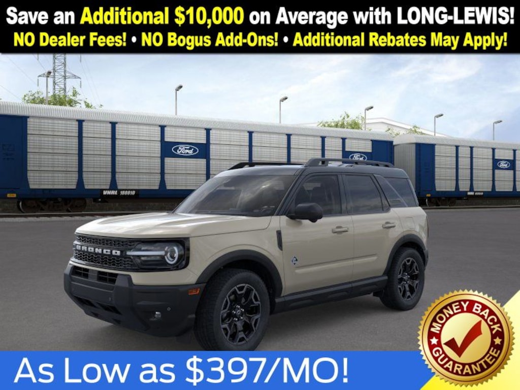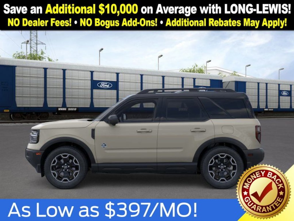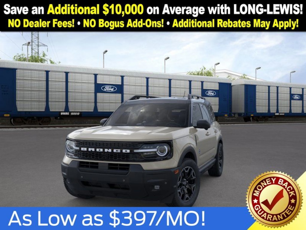 Desert Sand 2025 Ford Bronco Sport Outer Banks NFT 4WD 8-Speed Automatic 1.5L EcoBoost 360-Degree Camera w/Trail & Split View, 4-Wheel Disc Brakes, 6 Speakers, ABS brakes, Air Conditioning, Alloy wheels, AM/FM radio: SiriusXM, AM/FM Stereo, Auto High-beam Headlights, Auto-dimming Rear-View mirror, Automatic temperature control, B&O Sound System by Bang & Olufsen, Brake assist, Compass, Connected Navigation, Delay-off headlights, Driver door bin, Driver vanity mirror, Dual front impact airbags, Dual front side impact airbags, Electronic Stability Control, Emergency communication system: SYNC 4 911 Assist, Four wheel independent suspension, Front anti-roll bar, Front Bucket Seats, Front Center Armrest, Front Driver/Passenger Seat Back Map Pockets, Front dual zone A/C, Front fog lights, Front License Plate Bracket, Front Parking Sensors, Front reading lights, Fully automatic headlights, Garage door transmitter, HD Radio, Heated door mirrors, Heated front seats, Heated steering wheel, Illuminated entry, Knee airbag, Low tire pressure warning, Memory seat, Occupant sensing airbag, Outer Banks Tech Package+, Outside temperature display, Overhead airbag, Overhead console, Panic alarm, Passenger door bin, Passenger vanity mirror, Power door mirrors, Power driver seat, Power passenger seat, Power steering, Power windows, Premium Trimmed Front Bucket Seats w/Ebony/Roast, Radio data system, Rain sensing wipers, Rear anti-roll bar, Rear Parking Sensors, Rear reading lights, Rear seat center armrest, Rear window defroster, Rear window wiper, Remote keyless entry, Reverse Brake Assist, Security system, SiriusXM, Speed control, Speed-sensing steering, Speed-Sensitive Wipers, Split folding rear seat, Steering wheel mounted audio controls, SYNC 4 w/Enhanced Voice Recognition, Tachometer, Telescoping steering wheel, Tilt steering wheel, Traction control, Trip computer, Variably intermittent wipers, Wheels: 18" Ebony Black-Painted Aluminum.
