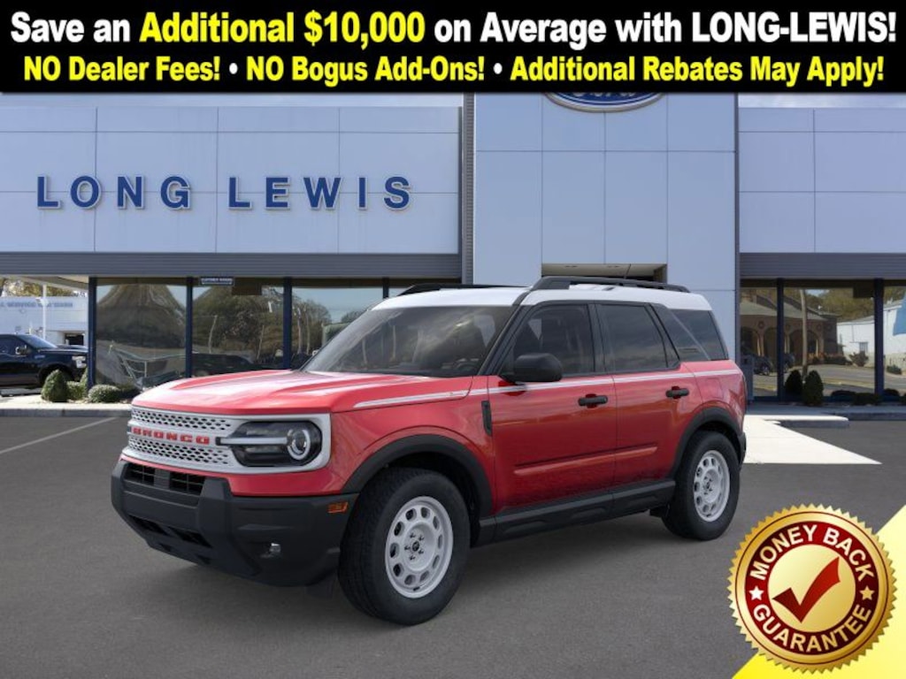 Ruby Red Metallic Tinted Clearcoat 2025 Ford Bronco Sport Heritage fctp 4WD 8-Speed Automatic 1.5L EcoBoost 4-Wheel Disc Brakes, 6 Speakers, ABS brakes, Air Conditioning, Alloy wheels, AM/FM radio: SiriusXM, AM/FM Stereo, Auto High-beam Headlights, Automatic temperature control, Brake assist, Compass, Convenience Package, Delay-off headlights, Driver door bin, Driver vanity mirror, Dual front impact airbags, Dual front side impact airbags, Electronic Stability Control, Emergency communication system: SYNC 4 911 Assist, Equipment Group 250A, Four wheel independent suspension, Front anti-roll bar, Front Bucket Seats, Front Center Armrest, Front Driver/Passenger Seat Back Map Pockets, Front reading lights, Fully automatic headlights, Heated 8-Way Power Driver's Seat, Heated door mirrors, Illuminated entry, Knee airbag, LED Fog Lamps, Low tire pressure warning, Occupant sensing airbag, Outside temperature display, Overhead airbag, Overhead console, Panic alarm, Passenger door bin, Passenger vanity mirror, Plaid Cloth Front Bucket Seats, Power door mirrors, Power steering, Power windows, Premium Wrapped Steering Wheel, Radio data system, Rear anti-roll bar, Rear Parking Sensors, Rear reading lights, Rear seat center armrest, Rear window defroster, Rear window wiper, Remote keyless entry, Security system, SiriusXM, Speed control, Speed-sensing steering, Speed-Sensitive Wipers, Split folding rear seat, Steering wheel mounted audio controls, SYNC 4 w/Enhanced Voice Recognition, Tachometer, Telescoping steering wheel, Tilt steering wheel, Traction control, Trip computer, Universal Garage Door Opener (UGDO), Variably intermittent wipers, Wheels: 17" Oxford White-Painted Aluminum.