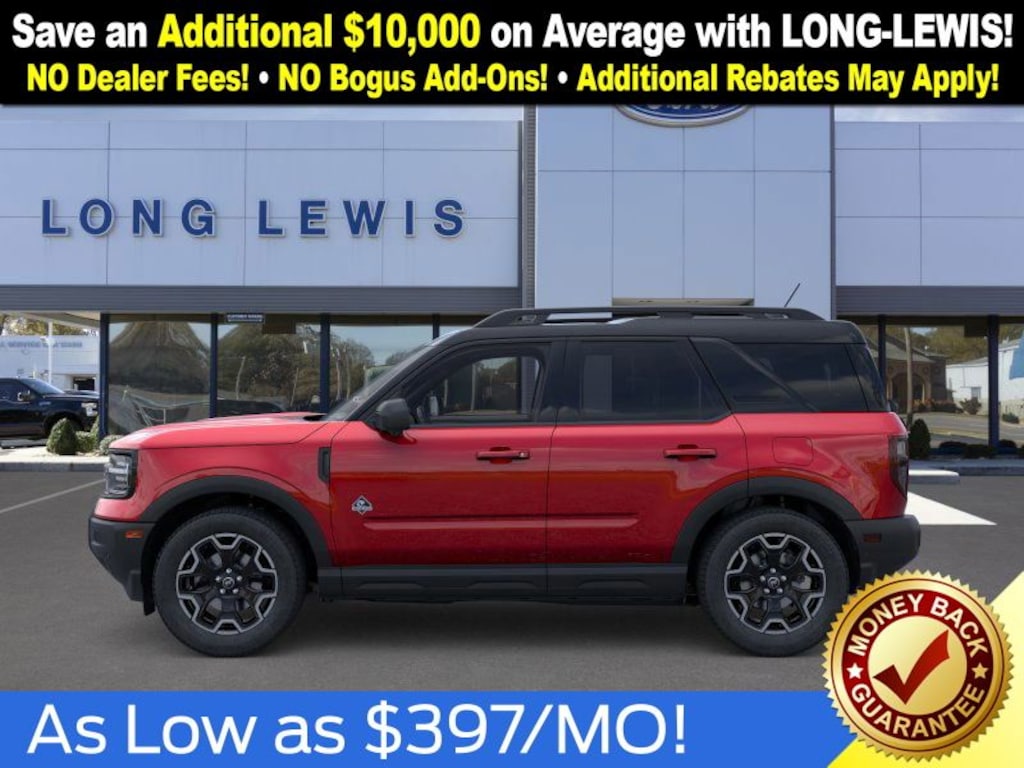 Ruby Red Metallic Tinted Clearcoat 2025 Ford Bronco Sport Outer Banks fctp 4WD 8-Speed Automatic 1.5L EcoBoost 360-Degree Camera w/Trail & Split View, 4-Wheel Disc Brakes, 6 Speakers, ABS brakes, Air Conditioning, Alloy wheels, AM/FM radio: SiriusXM, AM/FM Stereo, Auto High-beam Headlights, Auto-dimming Rear-View mirror, Automatic temperature control, B&O Sound System by Bang & Olufsen, Brake assist, Compass, Connected Navigation, Delay-off headlights, Driver door bin, Driver vanity mirror, Dual front impact airbags, Dual front side impact airbags, Electronic Stability Control, Emergency communication system: SYNC 4 911 Assist, Four wheel independent suspension, Front anti-roll bar, Front Bucket Seats, Front Center Armrest, Front Driver/Passenger Seat Back Map Pockets, Front dual zone A/C, Front fog lights, Front License Plate Bracket, Front Parking Sensors, Front reading lights, Fully automatic headlights, Garage door transmitter, HD Radio, Heated door mirrors, Heated front seats, Heated steering wheel, Illuminated entry, Knee airbag, Low tire pressure warning, Memory seat, Occupant sensing airbag, Outer Banks Tech Package+, Outside temperature display, Overhead airbag, Overhead console, Panic alarm, Passenger door bin, Passenger vanity mirror, Power door mirrors, Power driver seat, Power Moonroof, Power passenger seat, Power steering, Power windows, Premium Trimmed Front Bucket Seats w/Ebony/Roast, Radio data system, Rain sensing wipers, Rear anti-roll bar, Rear Parking Sensors, Rear reading lights, Rear seat center armrest, Rear window defroster, Rear window wiper, Remote keyless entry, Reverse Brake Assist, Security system, SiriusXM, Speed control, Speed-sensing steering, Speed-Sensitive Wipers, Split folding rear seat, Steering wheel mounted audio controls, SYNC 4 w/Enhanced Voice Recognition, Tachometer, Telescoping steering wheel, Tilt steering wheel, Traction control, Trip computer, Variably intermittent wipers, Wheels: 18" Ebony Black-Painted Aluminum.