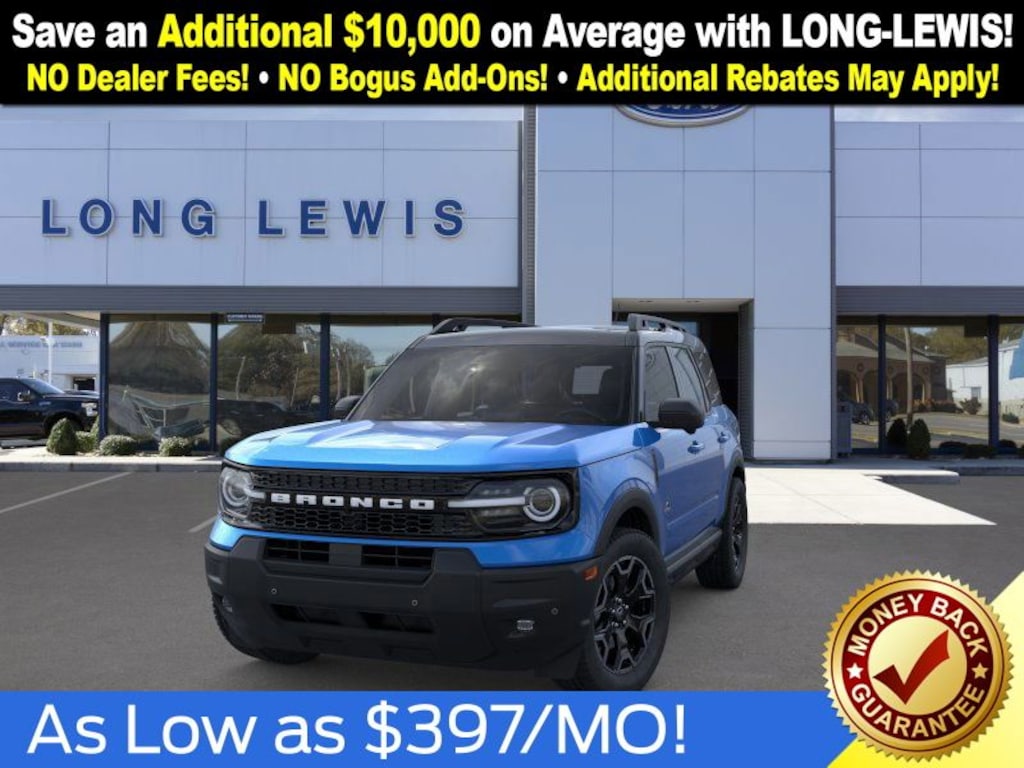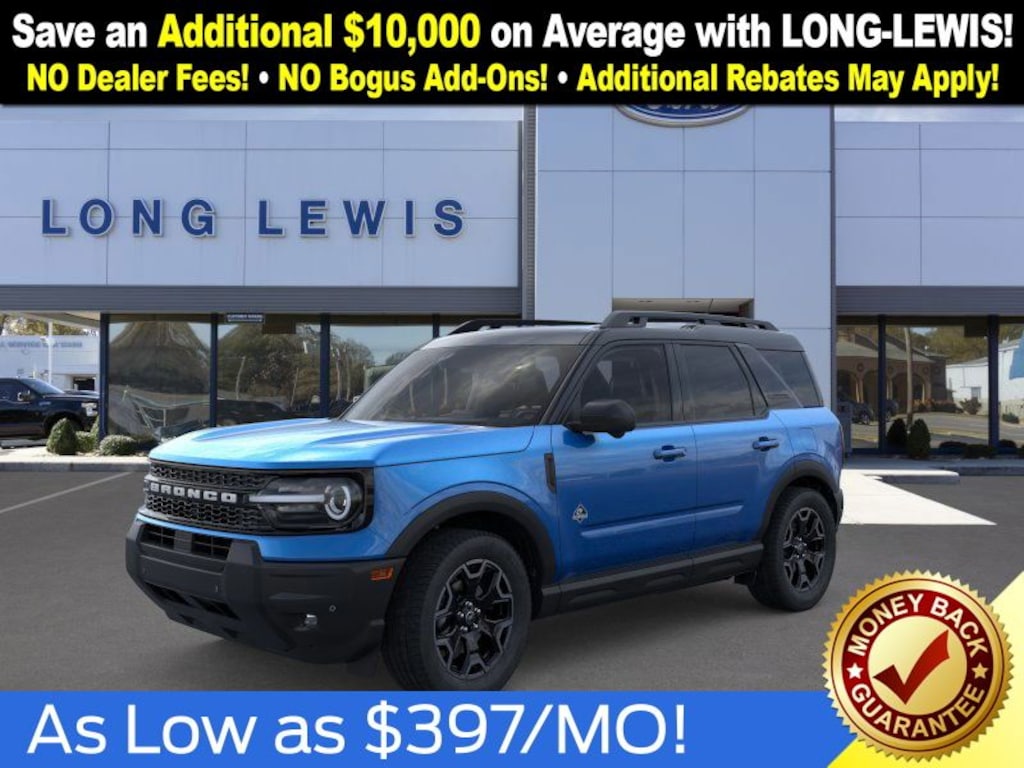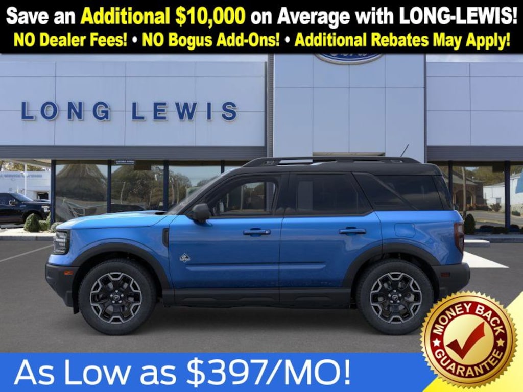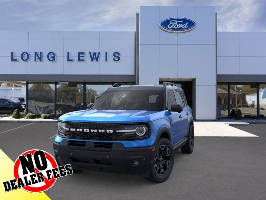 Velocity Blue Metallic 2025 Ford Bronco Sport Outer Banks fctp 4WD 8-Speed Automatic 1.5L EcoBoost 360-Degree Camera w/Trail & Split View, 4-Wheel Disc Brakes, 6 Speakers, ABS brakes, Air Conditioning, Alloy wheels, AM/FM radio: SiriusXM, AM/FM Stereo, Auto High-beam Headlights, Auto-dimming Rear-View mirror, Automatic temperature control, B&O Sound System by Bang & Olufsen, Brake assist, Compass, Connected Navigation, Delay-off headlights, Driver door bin, Driver vanity mirror, Dual front impact airbags, Dual front side impact airbags, Electronic Stability Control, Emergency communication system: SYNC 4 911 Assist, Four wheel independent suspension, Front anti-roll bar, Front Bucket Seats, Front Center Armrest, Front Driver/Passenger Seat Back Map Pockets, Front dual zone A/C, Front fog lights, Front License Plate Bracket, Front Parking Sensors, Front reading lights, Fully automatic headlights, Garage door transmitter, HD Radio, Heated door mirrors, Heated front seats, Heated steering wheel, Illuminated entry, Knee airbag, Low tire pressure warning, Memory seat, Occupant sensing airbag, Outer Banks Tech Package+, Outside temperature display, Overhead airbag, Overhead console, Panic alarm, Passenger door bin, Passenger vanity mirror, Power door mirrors, Power driver seat, Power Moonroof, Power passenger seat, Power steering, Power windows, Premium Trimmed Front Bucket Seats w/Ebony/Roast, Radio data system, Rain sensing wipers, Rear anti-roll bar, Rear Parking Sensors, Rear reading lights, Rear seat center armrest, Rear window defroster, Rear window wiper, Remote keyless entry, Reverse Brake Assist, Security system, SiriusXM, Speed control, Speed-sensing steering, Speed-Sensitive Wipers, Split folding rear seat, Steering wheel mounted audio controls, SYNC 4 w/Enhanced Voice Recognition, Tachometer, Telescoping steering wheel, Tilt steering wheel, Traction control, Trip computer, Variably intermittent wipers, Wheels: 18" Ebony Black-Painted Aluminum.