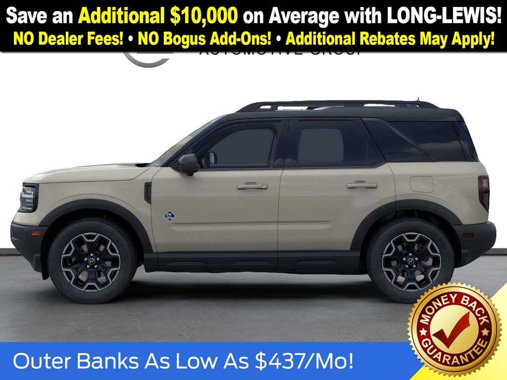 Dealer Discount of $2,238 off MSRP Desert Sand 2025 Ford Bronco Sport Outer Banks NFT 4WD 8-Speed Automatic 1.5L EcoBoost 360-Degree Camera w/Trail & Split View, 4-Wheel Disc Brakes, 6 Speakers, ABS brakes, Air Conditioning, Alloy wheels, AM/FM radio: SiriusXM, AM/FM Stereo, Auto High-beam Headlights, Auto-dimming Rear-View mirror, Automatic temperature control, B&O Sound System by Bang & Olufsen, Brake assist, Compass, Connected Navigation, Delay-off headlights, Driver door bin, Driver vanity mirror, Dual front impact airbags, Dual front side impact airbags, Electronic Stability Control, Emergency communication system: SYNC 4 911 Assist, Four wheel independent suspension, Front anti-roll bar, Front Bucket Seats, Front Center Armrest, Front Driver/Passenger Seat Back Map Pockets, Front dual zone A/C, Front fog lights, Front License Plate Bracket, Front Parking Sensors, Front reading lights, Fully automatic headlights, Garage door transmitter, HD Radio, Heated door mirrors, Heated front seats, Heated steering wheel, Illuminated entry, Knee airbag, Low tire pressure warning, Memory seat, Occupant sensing airbag, Outer Banks Tech Package+, Outside temperature display, Overhead airbag, Overhead console, Panic alarm, Passenger door bin, Passenger vanity mirror, Power door mirrors, Power driver seat, Power Moonroof, Power passenger seat, Power steering, Power windows, Premium Trimmed Front Bucket Seats w/Ebony/Roast, Radio data system, Rain sensing wipers, Rear anti-roll bar, Rear Parking Sensors, Rear reading lights, Rear seat center armrest, Rear window defroster, Rear window wiper, Remote keyless entry, Reverse Brake Assist, Security system, SiriusXM, Speed control, Speed-sensing steering, Speed-Sensitive Wipers, Split folding rear seat, Steering wheel mounted audio controls, SYNC 4 w/Enhanced Voice Recognition, Tachometer, Telescoping steering wheel, Tilt steering wheel, Traction control, Trip computer, Variably intermittent wipers, Wheels: 18" Ebony Black-Painted Aluminum.
