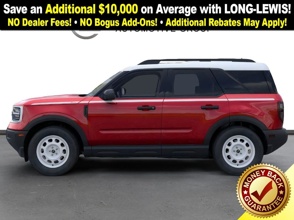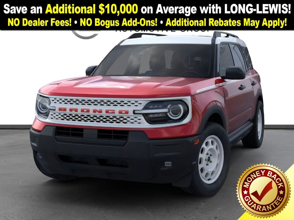 Dealer Discount of $1,658 off MSRP Ruby Red Metallic Tinted Clearcoat 2025 Ford Bronco Sport Heritage NFT 4WD 8-Speed Automatic 1.5L EcoBoost 4-Wheel Disc Brakes, 6 Speakers, ABS brakes, Air Conditioning, Alloy wheels, AM/FM radio: SiriusXM, AM/FM Stereo, Auto High-beam Headlights, Automatic temperature control, Brake assist, Compass, Convenience Package, Delay-off headlights, Driver door bin, Driver vanity mirror, Dual front impact airbags, Dual front side impact airbags, Electronic Stability Control, Emergency communication system: SYNC 4 911 Assist, Equipment Group 250A, Four wheel independent suspension, Front anti-roll bar, Front Bucket Seats, Front Center Armrest, Front Driver/Passenger Seat Back Map Pockets, Front License Plate Bracket, Front reading lights, Fully automatic headlights, Heated 8-Way Power Driver's Seat, Heated door mirrors, Illuminated entry, Knee airbag, LED Fog Lamps, Low tire pressure warning, Occupant sensing airbag, Outside temperature display, Overhead airbag, Overhead console, Panic alarm, Passenger door bin, Passenger vanity mirror, Plaid Cloth Front Bucket Seats, Power door mirrors, Power steering, Power windows, Premium Wrapped Steering Wheel, Radio data system, Rear anti-roll bar, Rear Parking Sensors, Rear reading lights, Rear seat center armrest, Rear window defroster, Rear window wiper, Remote keyless entry, Security system, SiriusXM, Speed control, Speed-sensing steering, Speed-Sensitive Wipers, Split folding rear seat, Steering wheel mounted audio controls, SYNC 4 w/Enhanced Voice Recognition, Tachometer, Telescoping steering wheel, Tilt steering wheel, Traction control, Trip computer, Universal Garage Door Opener (UGDO), Variably intermittent wipers, Wheels: 17" Oxford White-Painted Aluminum.