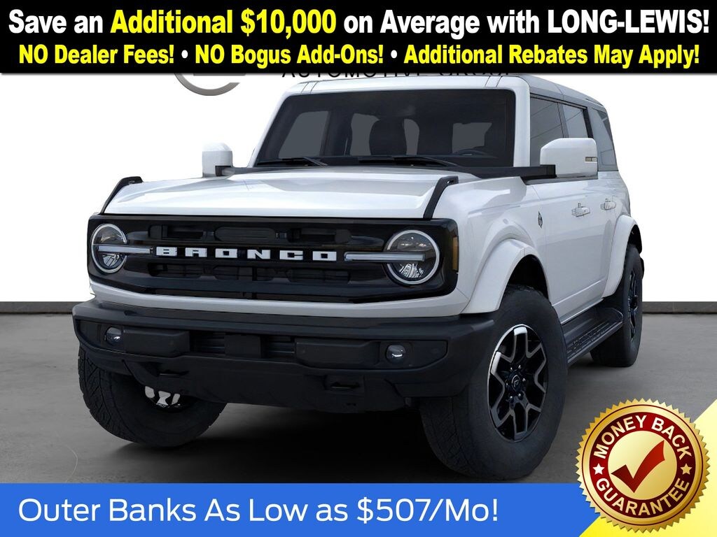 Oxford White 2025 Ford Bronco Outer Banks fctp 4WD 10-Speed Automatic 2.7L EcoBoost V6 18" Bright Machined Aluminum Wheels, 3.73 Axle Ratio, 4-Wheel Disc Brakes, 7 Speakers, ABS brakes, Air Conditioning, Alloy wheels, AM/FM radio: SiriusXM with 360L, AM/FM Stereo, Auto High-beam Headlights, Auto-dimming Rear-View mirror, Automatic temperature control, Brake assist, Compass, Connected Navigation, Delay-off headlights, Driver door bin, Driver vanity mirror, Dual front impact airbags, Dual front side impact airbags, Electronic Stability Control, Emergency communication system: 911 Assist, Exterior Parking Camera Rear, Front anti-roll bar, Front Bucket Seats, Front Center Armrest, Front dual zone A/C, Front fog lights, Front reading lights, Front wheel independent suspension, Fully automatic headlights, Heated door mirrors, Heated front seats, Heated Leather-Trimmed/Vinyl Bucket Seats, Heated steering wheel, Illuminated entry, Integrated roll-over protection, Leather Shift Knob, Low tire pressure warning, Navigation system: Connected Navigation, Occupant sensing airbag, Outside temperature display, Overhead airbag, Overhead console, Panic alarm, Passenger door bin, Passenger vanity mirror, Power door mirrors, Power driver seat, Power passenger seat, Power steering, Power windows, Radio data system, Rear seat center armrest, Remote keyless entry, Security system, SiriusXM w/360L, Speed control, Split folding rear seat, Steering wheel mounted audio controls, SYNC 4, Tachometer, Telescoping steering wheel, Tilt steering wheel, Traction control, Trip computer, Variably intermittent wipers, Voltmeter.