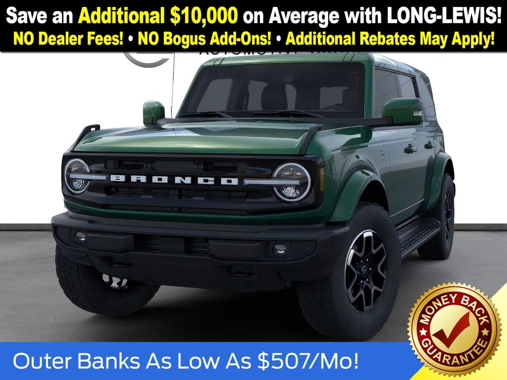 Dealer Discount of $2,073 off MSRP Eruption Green Metallic 2025 Ford Bronco Outer Banks NFT 4WD 10-Speed Automatic 2.7L EcoBoost V6 18" Bright Machined Aluminum Wheels, 3.73 Axle Ratio, 4-Wheel Disc Brakes, 7 Speakers, ABS brakes, Air Conditioning, Alloy wheels, AM/FM radio: SiriusXM with 360L, AM/FM Stereo, Auto High-beam Headlights, Auto-dimming Rear-View mirror, Automatic temperature control, Brake assist, Compass, Connected Navigation, Delay-off headlights, Driver door bin, Driver vanity mirror, Dual front impact airbags, Dual front side impact airbags, Electronic Stability Control, Emergency communication system: 911 Assist, Exterior Parking Camera Rear, Front anti-roll bar, Front Bucket Seats, Front Center Armrest, Front dual zone A/C, Front fog lights, Front reading lights, Front wheel independent suspension, Fully automatic headlights, Heated door mirrors, Heated front seats, Heated Leather-Trimmed/Vinyl Bucket Seats, Heated steering wheel, Illuminated entry, Integrated roll-over protection, Internet access capable: FordPass Connect, Leather Shift Knob, Low tire pressure warning, Navigation system: Connected Navigation, Occupant sensing airbag, Outside temperature display, Overhead airbag, Overhead console, Panic alarm, Passenger door bin, Passenger vanity mirror, Power door mirrors, Power driver seat, Power passenger seat, Power steering, Power windows, Radio data system, Rear seat center armrest, Remote keyless entry, Security system, SiriusXM w/360L, Speed control, Split folding rear seat, Steering wheel mounted audio controls, SYNC 4, Tachometer, Telescoping steering wheel, Tilt steering wheel, Traction control, Trip computer, Variably intermittent wipers, Voltmeter.