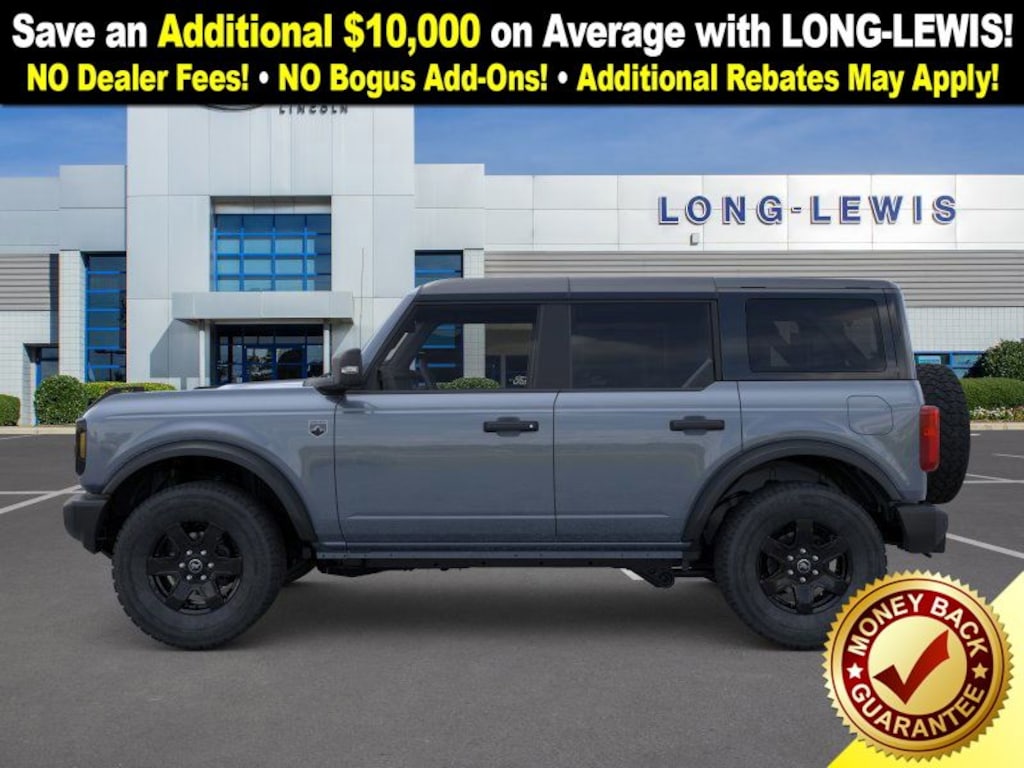 Dealer Discount of $2,435 off MSRP Azure Gray Metallic Tri-Coat 2025 Ford Bronco Big Bend 4WD 10-Speed Automatic 2.3L EcoBoost I-4 4-Wheel Disc Brakes, 4.46 Axle Ratio, 7 Speakers, ABS brakes, Air Conditioning, Alloy wheels, AM/FM radio: SiriusXM with 360L, AM/FM Stereo, Auto High-beam Headlights, Black Appearance Package, Black Molded-In-Color Door Handles, Black Molded-In-Color Fender Flares, Black Molded-In-Color Sideview Mirror Caps, Black-Painted Molded-In-Color Grille, Brake assist, Cloth Bucket Seats, Compass, Delay-off headlights, Driver door bin, Driver vanity mirror, Dual front impact airbags, Dual front side impact airbags, Electronic Stability Control, Emergency communication system: 911 Assist, Exterior Parking Camera Rear, Front anti-roll bar, Front Bucket Seats, Front Center Armrest, Front License Plate Bracket, Front reading lights, Front wheel independent suspension, Fully automatic headlights, Hard Top Sound Deadening Headliner, Heated door mirrors, Illuminated entry, Integrated roll-over protection, Leather Shift Knob, Low tire pressure warning, Occupant sensing airbag, Outside temperature display, Overhead airbag, Overhead console, Panic alarm, Passenger door bin, Passenger vanity mirror, Power door mirrors, Power steering, Power windows, Radio data system, Rear-Window Defroster & Washer, Remote keyless entry, Security system, Shadow Black Painted Hard Top, SiriusXM w/360L, Speed control, Split folding rear seat, Steering wheel mounted audio controls, SYNC 4, Tachometer, Telescoping steering wheel, Tilt steering wheel, Traction control, Trip computer, Variably intermittent wipers, Wheels: 17" Carbonized Gray-Painted Aluminum. Price includes: $2000 - Retail Bonus Cash. Exp. 01/05/2026