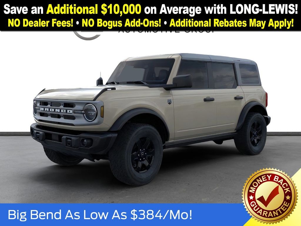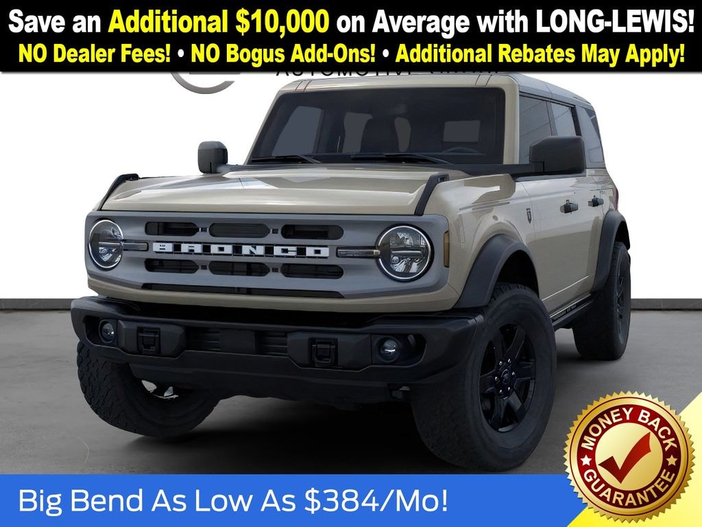 Desert Sand 2025 Ford Bronco Big Bend FCT 4WD 10-Speed Automatic 2.3L EcoBoost I-4 4-Wheel Disc Brakes, 7 Speakers, ABS brakes, Air Conditioning, Alloy wheels, AM/FM radio: SiriusXM with 360L, AM/FM Stereo, Auto High-beam Headlights, Auxiliary Switches, Black Diamond Package, Brake assist, Carbonized Gray Molded-In-Color Hard Top, Cloth Bucket Seats, Compass, Delay-off headlights, Driver door bin, Driver vanity mirror, Dual front impact airbags, Dual front side impact airbags, Electronic Stability Control, Emergency communication system: 911 Assist, Exterior Parking Camera Rear, Front anti-roll bar, Front Bucket Seats, Front Center Armrest, Front License Plate Bracket, Front reading lights, Front wheel independent suspension, Fully automatic headlights, Hard Top Sound Deadening Headliner, Heated door mirrors, Illuminated entry, Integrated roll-over protection, Internet access capable: FordPass Connect, Leather Shift Knob, LED Fog Lamps, Low tire pressure warning, Occupant sensing airbag, Outside temperature display, Overhead airbag, Overhead console, Panic alarm, Passenger door bin, Passenger vanity mirror, Powder Coated Steel Front & Rear Bumpers, Power door mirrors, Power steering, Power windows, Radio data system, Rear-Window Defroster & Washer, Remote keyless entry, Rock Rails, Security system, SiriusXM w/360L, Speed control, Split folding rear seat, Steering wheel mounted audio controls, SYNC 4, Tachometer, Telescoping steering wheel, Tilt steering wheel, Traction control, Trip computer, Variably intermittent wipers, Washout Capable Rubberized Flooring, Wheels: 17" Black High Gloss Painted Aluminum, Wheels: 17" Carbonized Gray-Painted Aluminum. Price includes: $2500 - Retail Customer Cash. Exp. 03/31/2026