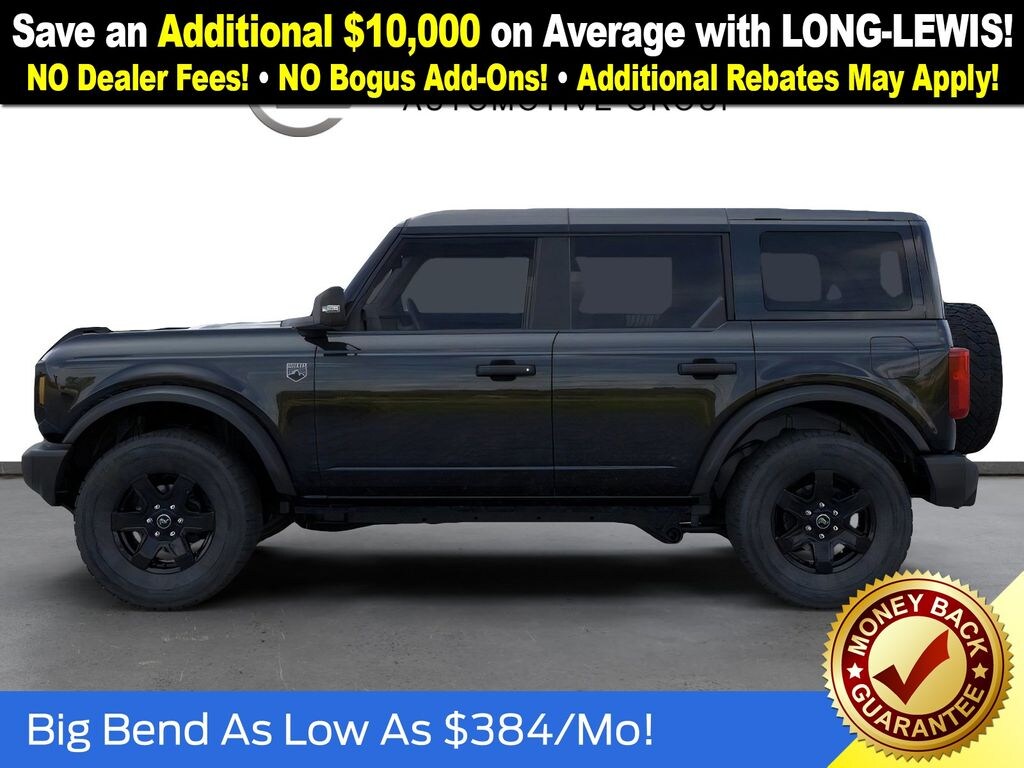 Shadow Black 2025 Ford Bronco Big Bend 4WD 2.3L EcoBoost I-4 4-Wheel Disc Brakes, 4.46 Axle Ratio, 7 Speakers, ABS brakes, Air Conditioning, Alloy wheels, AM/FM radio: SiriusXM with 360L, AM/FM Stereo, Auto High-beam Headlights, Brake assist, Cloth Bucket Seats, Compass, Delay-off headlights, Driver door bin, Driver vanity mirror, Dual front impact airbags, Dual front side impact airbags, Electronic Stability Control, Emergency communication system: 911 Assist, Exterior Parking Camera Rear, Front anti-roll bar, Front Bucket Seats, Front Center Armrest, Front reading lights, Front wheel independent suspension, Fully automatic headlights, Heated door mirrors, Illuminated entry, Integrated roll-over protection, Internet access capable: FordPass Connect, Leather Shift Knob, Low tire pressure warning, Occupant sensing airbag, Outside temperature display, Overhead airbag, Overhead console, Panic alarm, Passenger door bin, Passenger vanity mirror, Power door mirrors, Power steering, Power windows, Radio data system, Remote keyless entry, Security system, SiriusXM w/360L, Speed control, Split folding rear seat, Steering wheel mounted audio controls, SYNC 4, Tachometer, Telescoping steering wheel, Tilt steering wheel, Traction control, Trip computer, Variably intermittent wipers, Wheels: 17" Carbonized Gray-Painted Aluminum.