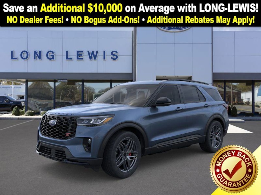 Vapor Blue Metallic 2025 Ford Explorer ST fctp 4WD 10-Speed Automatic 3.0L EcoBoost V6 4WD, 10 Speakers, 3.58 Non-Limited Slip Rear Axle, 3rd row seats: bench, 4-Wheel Disc Brakes, ABS brakes, Air Conditioning, Alloy wheels, Apple CarPlay/Android Auto, Auto High-beam Headlights, Auto-dimming door mirrors, Auto-dimming Rear-View mirror, Automatic temperature control, B&O Sound System by Bang & Olufsen, Brake assist, Bumpers: body-color, Compass, Delay-off headlights, Driver door bin, Driver vanity mirror, Dual front impact airbags, Dual front side impact airbags, Electronic Stability Control, Emergency communication system: 911 Assist, Exterior Parking Camera Rear, Four wheel independent suspension, Front anti-roll bar, Front Bucket Seats, Front Center Armrest, Front dual zone A/C, Front fog lights, Front License Plate Bracket, Front reading lights, Fully automatic headlights, Garage door transmitter, Heated door mirrors, Heated front seats, Heated rear seats, Heated steering wheel, Heated/Ventilated Miko Sport Captain's Chairs, Illuminated entry, Knee airbag, Leather steering wheel, Low tire pressure warning, Memory seat, Multicontour Seats w/Front Active Motion, Navigation System, Occupant sensing airbag, Outside temperature display, Overhead airbag, Overhead console, Panic alarm, Panoramic Vista Roof w/Power Shade, Passenger door bin, Passenger vanity mirror, Power door mirrors, Power driver seat, Power Liftgate, Power passenger seat, Power steering, Power windows, Radio: B&O Sound System by Bang & Olufsen, Rain sensing wipers, Rear air conditioning, Rear anti-roll bar, Rear reading lights, Rear window defroster, Rear window wiper, Remote keyless entry, SecuriCode Keyless Entry Keypad, Security system, Speed control, Speed-sensing steering, Speed-Sensitive Wipers, Split folding rear seat, Spoiler, Sport steering wheel, Steering wheel mounted audio controls, Sun and Sound Package, Tachometer, Telescoping steering wheel, Tilt steering wheel, Traction control, Trip computer, Turn signal indicator mirrors, Variably intermittent wipers, Ventilated front seats, Wheels: 21" Magnetite-Painted Aluminum, 4WD.