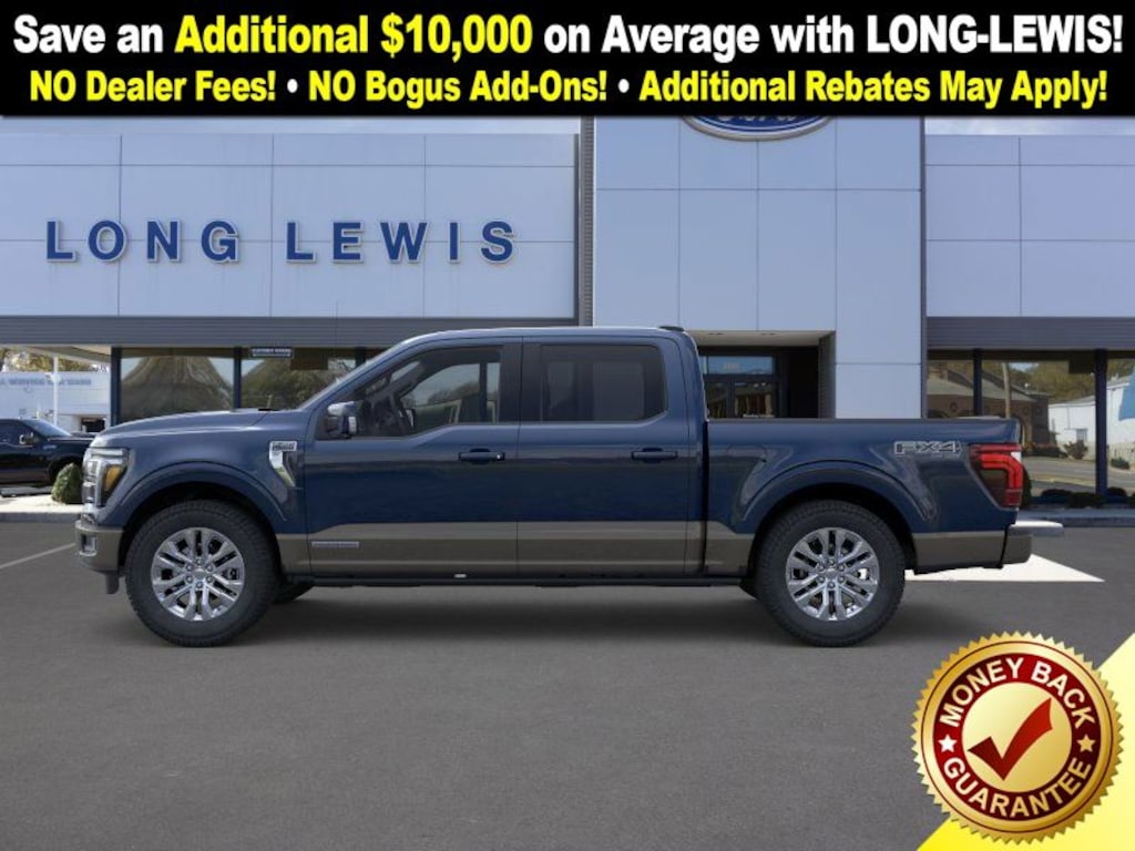 Antimatter Blue Metallic 2025 Ford F-150 King Ranch fctp 4WD 10-Speed Automatic 3.5L PowerBoost Full-Hybrid V6 3.5L PowerBoost Full-Hybrid V6, 4WD, 14 Speakers, 4-Wheel Disc Brakes, 4x4 FX4 Off-Road Bodyside Decal, ABS brakes, Adjustable pedals, Air Conditioning, Alloy wheels, AM/FM radio: SiriusXM with 360L, Auto High-beam Headlights, Auto tilt-away steering wheel, Auto-dimming door mirrors, Auto-dimming Rear-View mirror, Automatic temperature control, Brake assist, Chrome wheels, Compass, Delay-off headlights, Driver door bin, Driver vanity mirror, Dual front impact airbags, Dual front side impact airbags, Electronic Locking w/3.55 Axle Ratio, Electronic Stability Control, Emergency communication system: SYNC 4 911 Assist, Front anti-roll bar, Front Bucket Seats, Front Center Armrest, Front dual zone A/C, Front fog lights, Front License Plate Bracket, Front reading lights, Front wheel independent suspension, Fully automatic headlights, FX4 Off-Road Package, Garage door transmitter, Genuine wood dashboard insert, Heads-Up Display, Heated door mirrors, Heated front seats, Heated rear seats, Heated steering wheel, Hill Descent Control, Illuminated entry, King Ranch Multicontour Leather Bucket Seats, Leather steering wheel, Low tire pressure warning, Max Tow Electronic Locking w/3.73 Axle Ratio, Memory seat, Monotube Rear Shocks, Navigation system: Connected Navigation, Occupant sensing airbag, Off-Road Tuned Front Shock Absorbers, Outside temperature display, Overhead airbag, Overhead console, Panic alarm, Passenger door bin, Passenger vanity mirror, Pedal memory, Power door mirrors, Power driver seat, Power moonroof, Power passenger seat, Power steering, Power windows, Radio data system, Radio: B&O Unleashed Sound System by Bang & Olufsen, Rain sensing wipers, Rear reading lights, Rear seat center armrest, Rear step bumper, Rear window defroster, Remote keyless entry, Rock Crawl Mode, Security system, Speed control, Split folding rear seat, Steering wheel memory, Steering wheel mounted audio controls, SYNC 4 w/Enhanced Voice Recognition, Tachometer, Telescoping steering wheel, Tilt steering wheel, Traction control, Trip computer, Turn signal indicator mirrors, Variably intermittent wipers, Ventilated front seats, Voltmeter, Wheels: 20" Chrome-Like PVD, 3.5L PowerBoost Full-Hybrid V6, 4WD.