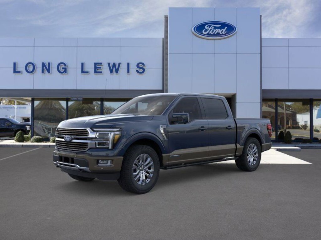 Antimatter Blue Metallic 2025 Ford F-150 King Ranch 4WD 10-Speed Automatic 3.5L PowerBoost Full-Hybrid V6 3.5L PowerBoost Full-Hybrid V6, 4WD, 14 Speakers, 4-Wheel Disc Brakes, 4x4 FX4 Off-Road Bodyside Decal, ABS brakes, Adjustable pedals, Air Conditioning, Alloy wheels, AM/FM radio: SiriusXM with 360L, Auto High-beam Headlights, Auto tilt-away steering wheel, Auto-dimming door mirrors, Auto-dimming Rear-View mirror, Automatic temperature control, Brake assist, Chrome wheels, Compass, Delay-off headlights, Driver door bin, Driver vanity mirror, Dual front impact airbags, Dual front side impact airbags, Electronic Locking w/3.55 Axle Ratio, Electronic Stability Control, Emergency communication system: SYNC 4 911 Assist, Front anti-roll bar, Front Bucket Seats, Front Center Armrest, Front dual zone A/C, Front fog lights, Front License Plate Bracket, Front reading lights, Front wheel independent suspension, Fully automatic headlights, FX4 Off-Road Package, Garage door transmitter, Genuine wood dashboard insert, Heads-Up Display, Heated door mirrors, Heated front seats, Heated rear seats, Heated steering wheel, Hill Descent Control, Illuminated entry, King Ranch Multicontour Leather Bucket Seats, Leather steering wheel, Low tire pressure warning, Max Tow Electronic Locking w/3.73 Axle Ratio, Memory seat, Monotube Rear Shocks, Navigation system: Connected Navigation, Occupant sensing airbag, Off-Road Tuned Front Shock Absorbers, Outside temperature display, Overhead airbag, Overhead console, Panic alarm, Passenger door bin, Passenger vanity mirror, Pedal memory, Power door mirrors, Power driver seat, Power moonroof, Power passenger seat, Power steering, Power windows, Radio data system, Radio: B&O Unleashed Sound System by Bang & Olufsen, Rain sensing wipers, Rear reading lights, Rear seat center armrest, Rear step bumper, Rear window defroster, Remote keyless entry, Rock Crawl Mode, Security system, Speed control, Split folding rear seat, Steering wheel memory, Steering wheel mounted audio controls, SYNC 4 w/Enhanced Voice Recognition, Tachometer, Telescoping steering wheel, Tilt steering wheel, Traction control, Trip computer, Turn signal indicator mirrors, Variably intermittent wipers, Ventilated front seats, Voltmeter, Wheels: 20" Chrome-Like PVD, 3.5L PowerBoost Full-Hybrid V6, 4WD.
