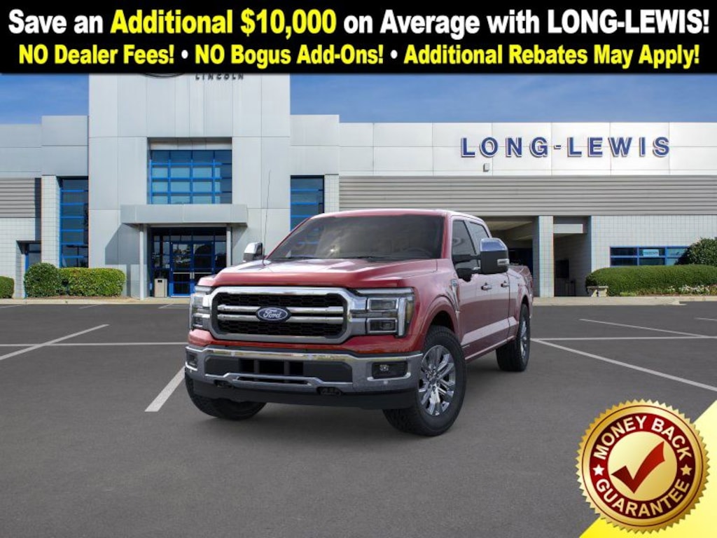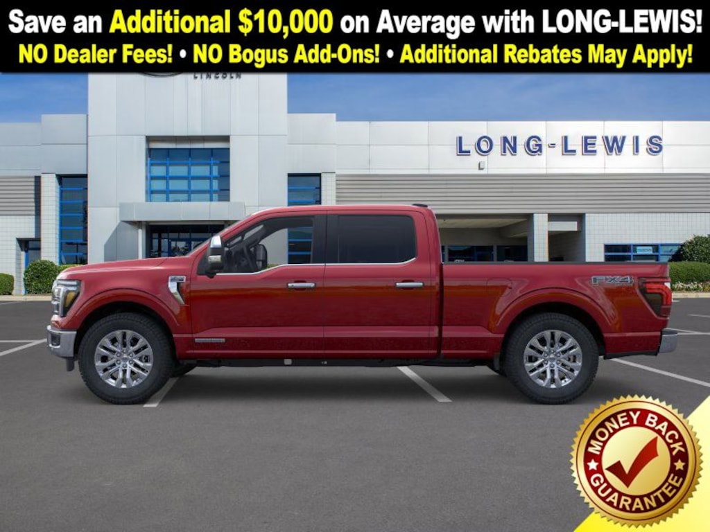 Dealer Discount of $6,887 off MSRP Rapid Red Metallic Tinted Clearcoat 2025 Ford F-150 Lariat fctp 4WD 10-Speed Automatic 3.5L PowerBoost Full-Hybrid V6 3.5L PowerBoost Full-Hybrid V6, 4WD, 4 Pickup Box Tie-Down Plates, 4-Wheel Disc Brakes, 4x4 FX4 Off-Road Bodyside Decal, 6" Extended Running Boards, 8 Speakers, ABS brakes, ActiveX Trimmed Bucket Seats, Adjustable pedals, Air Conditioning, Alloy wheels, AM/FM radio: SiriusXM with 360L, Auto High-beam Headlights, Auto-dimming door mirrors, Auto-dimming Rear-View mirror, Automatic temperature control, Bed Utility Package, Brake assist, Bumpers: chrome, Chrome wheels, Compass, Console Worksurface, Delay-off headlights, Driver door bin, Driver vanity mirror, Dual front impact airbags, Dual front side impact airbags, Electronic Stability Control, Emergency communication system: SYNC 4 911 Assist, Equipment Group 501A Mid, Front anti-roll bar, Front Bucket Seats, Front Center Armrest, Front dual zone A/C, Front fog lights, Front License Plate Bracket, Front reading lights, Front wheel independent suspension, Fully automatic headlights, FX4 Off-Road Package, Garage door transmitter, Heated door mirrors, Heated front seats, Heated steering wheel, Hill Descent Control, Illuminated entry, Internet access capable: FordPass Connect 5G, LED Box Lighting, Low tire pressure warning, Memory seat, Mobile Office Package, Monotube Rear Shocks, Navigation system: Connected Navigation, Occupant sensing airbag, Off-Road Tuned Front Shock Absorbers, Outside temperature display, Overhead airbag, Overhead console, Panic alarm, Partitioned Lockable Rear Storage, Passenger door bin, Passenger vanity mirror, Pedal memory, Power door mirrors, Power driver seat, Power passenger seat, Power steering, Power Tailgate, Power Telescoping/Glass/Folding Trailer Tow Mirrors, Power windows, Pro Access Tailgate, Pro Power Onboard - 7.2KW, Radio data system, Radio: B&O Sound System by Bang & Olufsen, Rain sensing wipers, Rear reading lights, Rear seat center armrest, Rear step bumper, Rear window defroster, Remote keyless entry, Rock Crawl Mode, Security system, Speed control, Split folding rear seat, Steering wheel mounted audio controls, SYNC 4 w/Enhanced Voice Recognition, Tachometer, Telescoping steering wheel, Tilt steering wheel, Tow/Haul Package, Traction control, Tray Style Floor Liner w/o Carpet Mats, Trip computer, Turn signal indicator mirrors, Twin Panel Moonroof, Variably intermittent wipers, Ventilated front seats, Voltmeter, Wheels: 18" Chrome-Like PVD, Wheels: 20" Chrome-Like PVD, Wireless Charging, 3.5L PowerBoost Full-Hybrid V6, 4WD. Price includes: $1000 - Final Days Mega Bonus Cash. Exp. 01/02/2026 $2000 - Retail Customer Cash. Exp. 01/05/2026