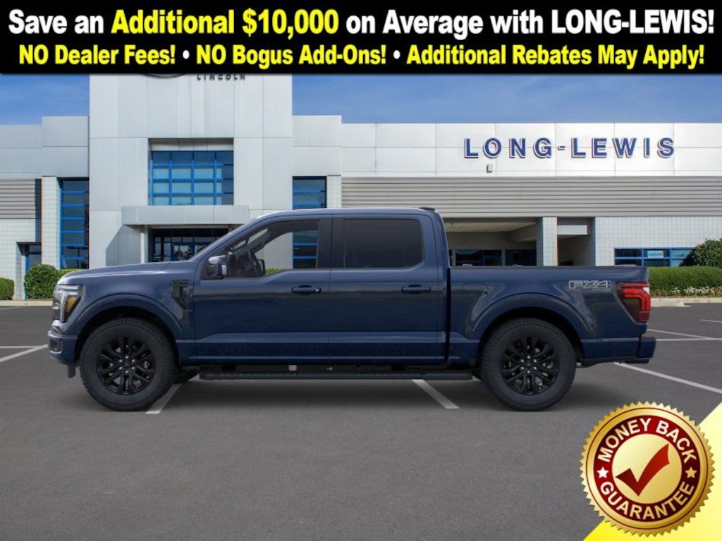 New Price! Dealer Discount of $4,672 off MSRP Antimatter Blue Metallic 2025 Ford F-150 Lariat NFT 4WD 10-Speed Automatic 5.0L V8 4WD, 4 Pickup Box Tie-Down Plates, 4-Wheel Disc Brakes, 4x4 FX4 Off-Road Bodyside Decal, 6" Extended Running Boards, 8 Speakers, ABS brakes, ActiveX Trimmed Bucket Seats, Adjustable pedals, Air Conditioning, Alloy wheels, AM/FM radio: SiriusXM with 360L, Auto High-beam Headlights, Auto-dimming door mirrors, Auto-dimming Rear-View mirror, Automatic temperature control, Bed Utility Package, Brake assist, Bumpers: chrome, Chrome wheels, Compass, Delay-off headlights, Driver door bin, Driver vanity mirror, Dual front impact airbags, Dual front side impact airbags, Electronic Stability Control, Emergency communication system: SYNC 4 911 Assist, Front anti-roll bar, Front Bucket Seats, Front Center Armrest, Front dual zone A/C, Front fog lights, Front License Plate Bracket, Front reading lights, Front wheel independent suspension, Fully automatic headlights, FX4 Off-Road Package, Garage door transmitter, Heated door mirrors, Heated front seats, Heated steering wheel, Hill Descent Control, Illuminated entry, LED Box Lighting, Low tire pressure warning, Memory seat, Monotube Rear Shocks, Navigation system: Connected Navigation, Occupant sensing airbag, Off-Road Tuned Front Shock Absorbers, Outside temperature display, Overhead airbag, Overhead console, Panic alarm, Passenger door bin, Passenger vanity mirror, Pedal memory, Power door mirrors, Power driver seat, Power passenger seat, Power steering, Power Tailgate, Power windows, Pro Access Tailgate, Radio data system, Radio: B&O Sound System by Bang & Olufsen, Rain sensing wipers, Rear reading lights, Rear seat center armrest, Rear step bumper, Rear window defroster, Remote keyless entry, Rock Crawl Mode, Security system, Speed control, Split folding rear seat, Steering wheel mounted audio controls, SYNC 4 w/Enhanced Voice Recognition, Tachometer, Telescoping steering wheel, Tilt steering wheel, Traction control, Tray Style Floor Liner w/o Carpet Mats, Trip computer, Turn signal indicator mirrors, Variably intermittent wipers, Ventilated front seats, Voltmeter, Wheels: 18" Chrome-Like PVD, 4WD.