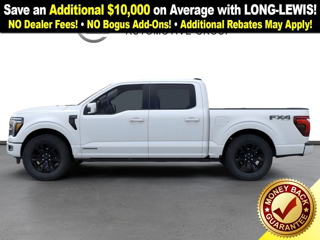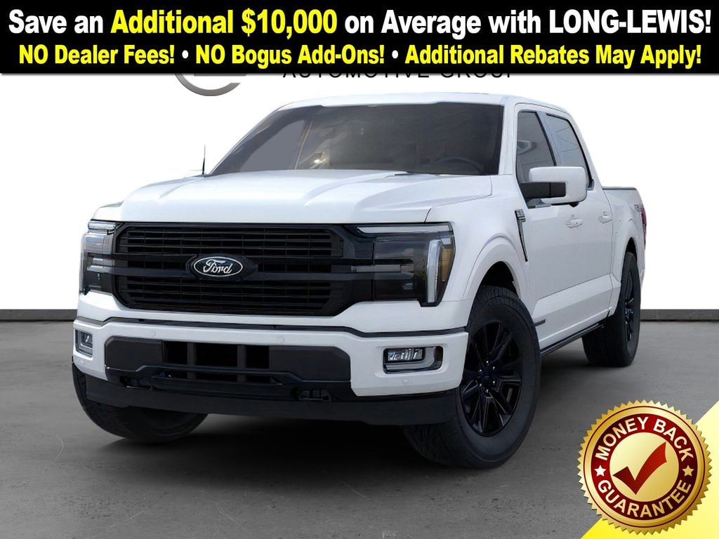 Star White Metallic Tri-Coat 2025 Ford F-150 Platinum FCT 4WD 10-Speed Automatic 3.5L PowerBoost Full-Hybrid V6 3.5L PowerBoost Full-Hybrid V6, 4WD, 4-Wheel Disc Brakes, 4x4 FX4 Off-Road Bodyside Decal, 8 Speakers, ABS brakes, Adjustable pedals, Air Conditioning, Alloy wheels, AM/FM radio: SiriusXM with 360L, Auto High-beam Headlights, Auto tilt-away steering wheel, Auto-dimming door mirrors, Auto-dimming Rear-View mirror, Automatic temperature control, Brake assist, Bumpers: body-color, Compass, Delay-off headlights, Driver door bin, Driver vanity mirror, Dual front impact airbags, Dual front side impact airbags, Electronic Stability Control, Emergency communication system: SYNC 4 911 Assist, Equipment Group 702A High, Front anti-roll bar, Front Bucket Seats, Front Center Armrest, Front dual zone A/C, Front fog lights, Front License Plate Bracket, Front reading lights, Front wheel independent suspension, Fully automatic headlights, FX4 Off-Road Package, Garage door transmitter, Heated door mirrors, Heated front seats, Heated rear seats, Heated steering wheel, Hill Descent Control, Illuminated entry, Internet access capable: FordPass Connect 5G, Leather steering wheel, Low tire pressure warning, Memory seat, Monotube Rear Shocks, Navigation system: Connected Navigation, Occupant sensing airbag, Off-Road Tuned Front Shock Absorbers, Outside temperature display, Overhead airbag, Overhead console, Panic alarm, Passenger door bin, Passenger vanity mirror, Pedal memory, Power door mirrors, Power driver seat, Power passenger seat, Power steering, Power windows, Radio data system, Radio: B&O Sound System by Bang & Olufsen, Rain sensing wipers, Rear reading lights, Rear seat center armrest, Rear step bumper, Rear window defroster, Remote keyless entry, Rock Crawl Mode, Security system, Speed control, Split folding rear seat, Steering wheel memory, Steering wheel mounted audio controls, SYNC 4 w/Enhanced Voice Recognition, Tachometer, Telescoping steering wheel, Tilt steering wheel, Traction control, Tray Style Floor Liner, Trip computer, Turn signal indicator mirrors, Unique Multi-Contour Leather Bucket Seats, Variably intermittent wipers, Ventilated front seats, Voltmeter, Wheels: 20" Painted Gloss Ebony Black, 3.5L PowerBoost Full-Hybrid V6, 4WD.