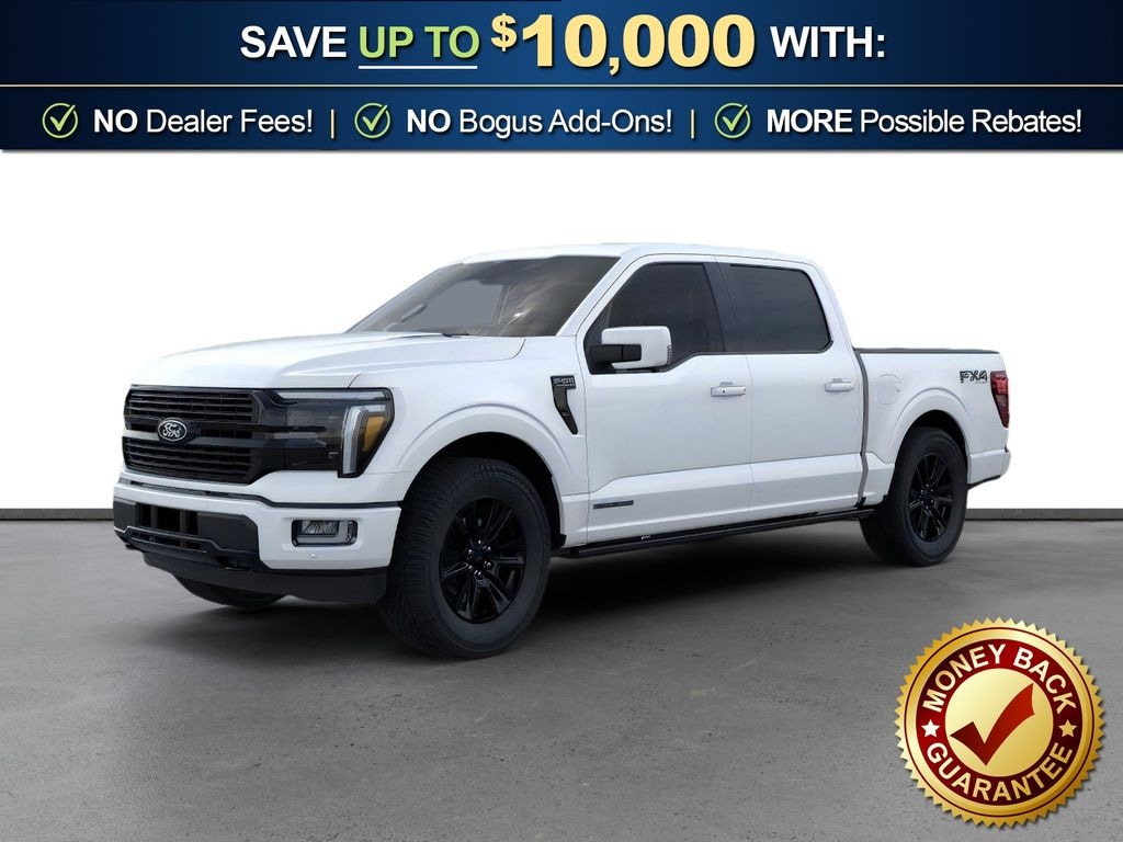 Dealer Discount of $7,429 off MSRP Star White Metallic Tri-Coat 2025 Ford F-150 Platinum NFT 4WD 10-Speed Automatic 3.5L PowerBoost Full-Hybrid V6 3.5L PowerBoost Full-Hybrid V6, 4WD, 4-Wheel Disc Brakes, 4x4 FX4 Off-Road Bodyside Decal, 8 Speakers, ABS brakes, Adjustable pedals, Air Conditioning, Alloy wheels, AM/FM radio: SiriusXM with 360L, Auto High-beam Headlights, Auto tilt-away steering wheel, Auto-dimming door mirrors, Auto-dimming Rear-View mirror, Automatic temperature control, Brake assist, Bumpers: body-color, Compass, Delay-off headlights, Driver door bin, Driver vanity mirror, Dual front impact airbags, Dual front side impact airbags, Electronic Stability Control, Emergency communication system: SYNC 4 911 Assist, Equipment Group 702A High, Front anti-roll bar, Front Bucket Seats, Front Center Armrest, Front dual zone A/C, Front fog lights, Front License Plate Bracket, Front reading lights, Front wheel independent suspension, Fully automatic headlights, FX4 Off-Road Package, Garage door transmitter, Heated door mirrors, Heated front seats, Heated rear seats, Heated steering wheel, Hill Descent Control, Illuminated entry, Internet access capable: FordPass Connect 5G, Leather steering wheel, Low tire pressure warning, Memory seat, Monotube Rear Shocks, Navigation system: Connected Navigation, Occupant sensing airbag, Off-Road Tuned Front Shock Absorbers, Outside temperature display, Overhead airbag, Overhead console, Panic alarm, Passenger door bin, Passenger vanity mirror, Pedal memory, Power door mirrors, Power driver seat, Power passenger seat, Power steering, Power windows, Radio data system, Radio: B&O Sound System by Bang & Olufsen, Rain sensing wipers, Rear reading lights, Rear seat center armrest, Rear step bumper, Rear window defroster, Remote keyless entry, Rock Crawl Mode, Security system, Speed control, Split folding rear seat, Steering wheel memory, Steering wheel mounted audio controls, SYNC 4 w/Enhanced Voice Recognition, Tachometer, Telescoping steering wheel, Tilt steering wheel, Traction control, Tray Style Floor Liner, Trip computer, Turn signal indicator mirrors, Unique Multi-Contour Leather Bucket Seats, Variably intermittent wipers, Ventilated front seats, Voltmeter, Wheels: 20" Painted Gloss Ebony Black, 3.5L PowerBoost Full-Hybrid V6, 4WD.
