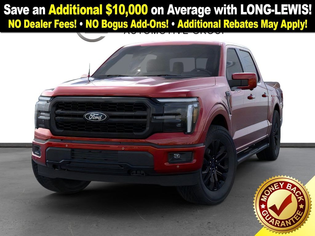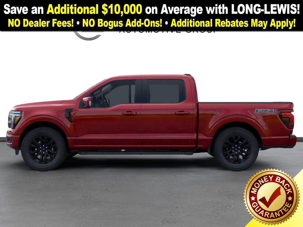 Rapid Red Metallic Tinted Clearcoat 2025 Ford F-150 Lariat FCT 4WD 10-Speed Automatic 5.0L V8 4WD, 4-Wheel Disc Brakes, 4x4 FX4 Off-Road Bodyside Decal, 8 Speakers, ABS brakes, ActiveX Trimmed Bucket Seats, Adjustable pedals, Air Conditioning, Alloy wheels, AM/FM radio: SiriusXM with 360L, Auto High-beam Headlights, Auto-dimming door mirrors, Auto-dimming Rear-View mirror, Automatic temperature control, Brake assist, Bumpers: chrome, Chrome wheels, Compass, Delay-off headlights, Driver door bin, Driver vanity mirror, Dual front impact airbags, Dual front side impact airbags, Electronic Stability Control, Emergency communication system: SYNC 4 911 Assist, Front anti-roll bar, Front Bucket Seats, Front Center Armrest, Front dual zone A/C, Front fog lights, Front License Plate Bracket, Front reading lights, Front wheel independent suspension, Fully automatic headlights, FX4 Off-Road Package, Garage door transmitter, Heated door mirrors, Heated front seats, Heated steering wheel, Hill Descent Control, Illuminated entry, Internet access capable: FordPass Connect 5G, Low tire pressure warning, Memory seat, Monotube Rear Shocks, Navigation system: Connected Navigation, Occupant sensing airbag, Off-Road Tuned Front Shock Absorbers, Outside temperature display, Overhead airbag, Overhead console, Panic alarm, Passenger door bin, Passenger vanity mirror, Pedal memory, Power door mirrors, Power driver seat, Power passenger seat, Power steering, Power windows, Radio data system, Radio: B&O Sound System by Bang & Olufsen, Rain sensing wipers, Rear reading lights, Rear seat center armrest, Rear step bumper, Rear window defroster, Remote keyless entry, Rock Crawl Mode, Security system, Speed control, Split folding rear seat, Steering wheel mounted audio controls, SYNC 4 w/Enhanced Voice Recognition, Tachometer, Telescoping steering wheel, Tilt steering wheel, Traction control, Tray Style Floor Liner w/o Carpet Mats, Trip computer, Turn signal indicator mirrors, Variably intermittent wipers, Ventilated front seats, Voltmeter, Wheels: 18" Chrome-Like PVD, 4WD.