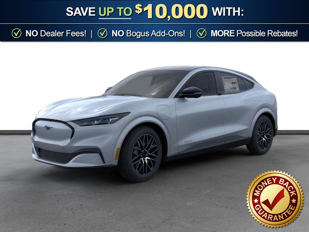 Glacier Gray Metallic TriCoat 2025 Ford Mustang Mach-E Premium FCT RWD Single-Speed Automatic Dual Electric Motor 10 Speakers, 4-Wheel Disc Brakes, ABS brakes, Air Conditioning, Alloy wheels, AM/FM radio: SiriusXM with 360L, Apple CarPlay/Android Auto, Auto High-beam Headlights, Auto-dimming Rear-View mirror, Automatic temperature control, Brake assist, Bumpers: body-color, Compass, Delay-off headlights, Driver door bin, Driver vanity mirror, Dual front impact airbags, Dual front side impact airbags, Electronic Stability Control, Emergency communication system: 911 Assist, Equipment Group 300A Standard Package, Exterior Parking Camera Rear, Four wheel independent suspension, Front anti-roll bar, Front Bucket Seats, Front Center Armrest, Front dual zone A/C, Front reading lights, Fully automatic headlights, Garage door transmitter, Heated door mirrors, Heated front seats, Heated steering wheel, Heated/Ventilated Perforated ActiveX Bucket Seats, Illuminated entry, Internet access capable: FordPass Connect, Knee airbag, Low tire pressure warning, Memory seat, Mobile Power Cord (120V/240V), Navigation system: Connected Navigation, Occupant sensing airbag, Outside temperature display, Overhead airbag, Overhead console, Panic alarm, Panoramic Fixed-Glass Roof, Passenger door bin, Passenger vanity mirror, Power door mirrors, Power driver seat, Power Liftgate, Power passenger seat, Power steering, Power windows, Radio data system, Radio: B&O Sound System by Bang & Olufsen, Rain sensing wipers, Rear anti-roll bar, Rear seat center armrest, Rear side impact airbag, Rear window defroster, Rear window wiper, Remote keyless entry, Security system, SiriusXM w/360L, Speed control, Speed-sensing steering, Speed-Sensitive Wipers, Split folding rear seat, Spoiler, Steering wheel mounted audio controls, SYNC 4A w/Enhanced Voice Recognition, Telescoping steering wheel, Tilt steering wheel, Tire Inflator & Sealant Kit, Traction control, Trip computer, Turn signal indicator mirrors, Variably intermittent wipers, Ventilated front seats, Wheels: 19" Bright Machined-Face Aluminum.