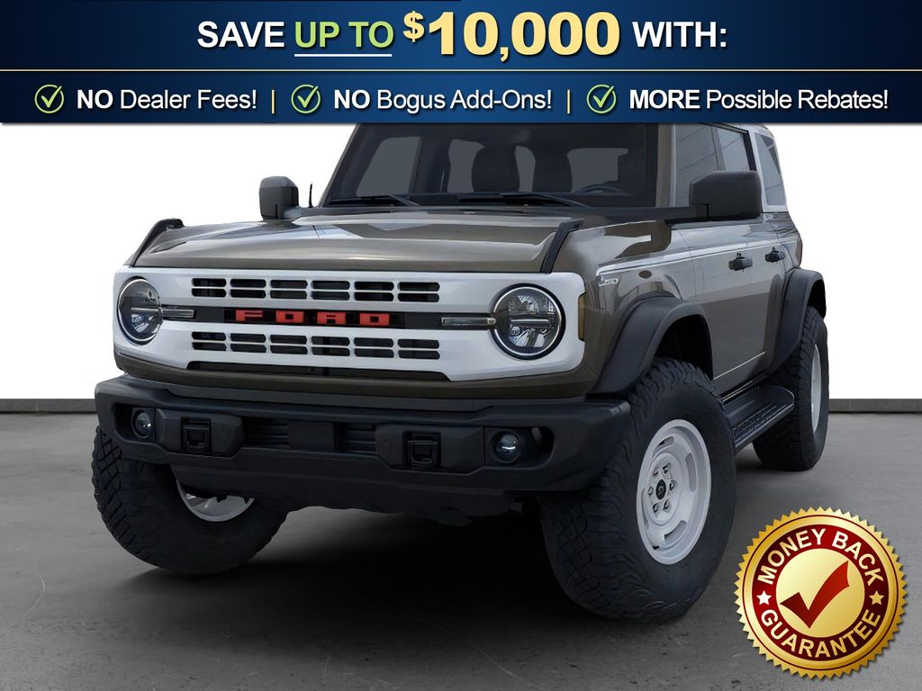 Marsh Gray 2026 Ford Bronco Heritage Edition NFT 4WD 10-Speed Automatic 2.7L EcoBoost V6 4-Wheel Disc Brakes, 7 Speakers, ABS brakes, Air Conditioning, Alloy wheels, AM/FM radio: SiriusXM with 360L, AM/FM Stereo, Auto High-beam Headlights, Auto-dimming Rear-View mirror, Automatic temperature control, Brake assist, Compass, Connected Navigation, Convertible HardTop, Convertible roof lining, Delay-off headlights, Driver door bin, Driver vanity mirror, Dual front impact airbags, Dual front side impact airbags, Electronic Stability Control, Emergency communication system: 911 Assist, Exterior Parking Camera Rear, Ford Connectivity Package (1-Year Included), Front anti-roll bar, Front Bucket Seats, Front Center Armrest, Front dual zone A/C, Front fog lights, Front License Plate Bracket, Front reading lights, Front wheel independent suspension, Fully automatic headlights, Glass rear window, Heated door mirrors, Heated front seats, Heated steering wheel, Illuminated entry, Integrated roll-over protection, Low tire pressure warning, Navigation system: Connected Navigation, Occupant sensing airbag, Outside temperature display, Overhead airbag, Overhead console, Panic alarm, Passenger door bin, Passenger vanity mirror, Plaid Cloth Front Heated Bucket Seats, Power door mirrors, Power steering, Power windows, Radio data system, Rear window defroster, Rear window wiper, Remote keyless entry, Security system, SiriusXM with 360L, Speed control, Split folding rear seat, Steering wheel mounted audio controls, SYNC 4, Tachometer, Telescoping steering wheel, Tilt steering wheel, Traction control, Trip computer, Variably intermittent wipers, Wheels: 17" Unique White.