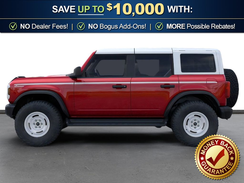 Dealer Discount of $935 off MSRP Ruby Red Metallic Tinted Clearcoat 2026 Ford Bronco Heritage Edition NFT 4WD 10-Speed Automatic 2.7L EcoBoost V6 4-Wheel Disc Brakes, 7 Speakers, ABS brakes, Air Conditioning, Alloy wheels, AM/FM radio: SiriusXM with 360L, AM/FM Stereo, Auto High-beam Headlights, Auto-dimming Rear-View mirror, Automatic temperature control, Brake assist, Compass, Connected Navigation, Convertible HardTop, Convertible roof lining, Delay-off headlights, Driver door bin, Driver vanity mirror, Dual front impact airbags, Dual front side impact airbags, Electronic Stability Control, Emergency communication system: 911 Assist, Exterior Parking Camera Rear, Ford Connectivity Package (1-Year Included), Front anti-roll bar, Front Bucket Seats, Front Center Armrest, Front dual zone A/C, Front fog lights, Front License Plate Bracket, Front reading lights, Front wheel independent suspension, Fully automatic headlights, Glass rear window, Heated door mirrors, Heated front seats, Heated steering wheel, Illuminated entry, Integrated roll-over protection, Low tire pressure warning, Navigation system: Connected Navigation, Occupant sensing airbag, Outside temperature display, Overhead airbag, Overhead console, Panic alarm, Passenger door bin, Passenger vanity mirror, Plaid Cloth Front Heated Bucket Seats, Power door mirrors, Power steering, Power windows, Radio data system, Rear window defroster, Rear window wiper, Remote keyless entry, Security system, SiriusXM with 360L, Speed control, Split folding rear seat, Steering wheel mounted audio controls, SYNC 4, Tachometer, Telescoping steering wheel, Tilt steering wheel, Traction control, Trip computer, Variably intermittent wipers, Wheels: 17" Unique White.