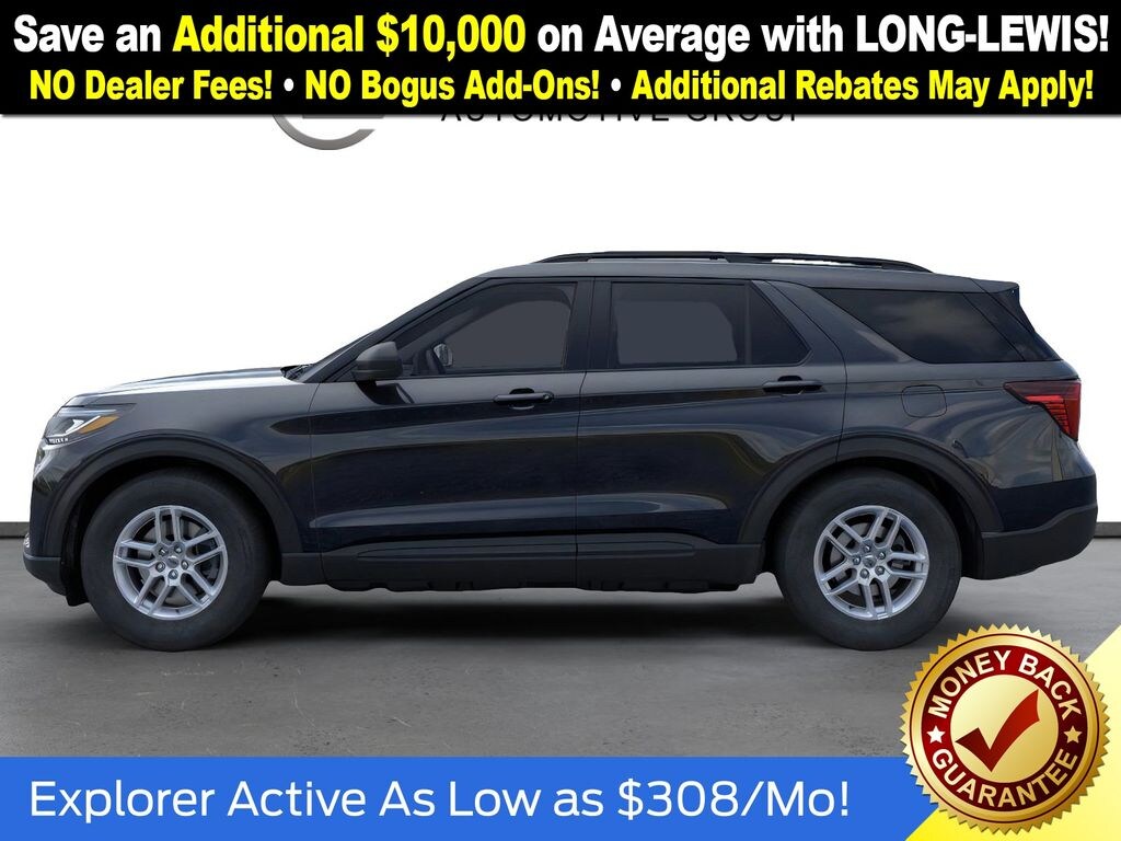 Agate Black Metallic 2026 Ford Explorer Active NFT RWD 10-Speed Automatic 2.3L EcoBoost I-4 3rd row seats: bench, 4-Wheel Disc Brakes, 6 Speakers, ABS brakes, Air Conditioning, Alloy wheels, AM/FM radio: SiriusXM with 360L, AM/FM Stereo, Apple CarPlay/Android Auto, Auto High-beam Headlights, Automatic temperature control, Brake assist, Bumpers: body-color, Compass, Delay-off headlights, Driver door bin, Driver vanity mirror, Dual front impact airbags, Dual front side impact airbags, Electronic Stability Control, Emergency communication system: 911 Assist, Exterior Parking Camera Rear, Four wheel independent suspension, Front anti-roll bar, Front Bucket Seats, Front Center Armrest, Front dual zone A/C, Front License Plate Bracket, Front reading lights, Fully automatic headlights, Heated ActiveX Seating Material Captain's Chairs, Heated door mirrors, Illuminated entry, Internet access capable: FordPass Connect 5G, Knee airbag, Low tire pressure warning, Navigation System, Occupant sensing airbag, Outside temperature display, Overhead airbag, Overhead console, Panic alarm, Passenger door bin, Passenger vanity mirror, Power driver seat, Power steering, Power windows, Rear air conditioning, Rear anti-roll bar, Rear reading lights, Rear window defroster, Rear window wiper, Remote keyless entry, Security system, Speed control, Speed-sensing steering, Speed-Sensitive Wipers, Split folding rear seat, Spoiler, Steering wheel mounted audio controls, Tachometer, Telescoping steering wheel, Tilt steering wheel, Traction control, Trip computer, Unique Cloth Captain's Chairs, Variably intermittent wipers, Wheels: 18" Sparkle Silver-Painted Aluminum.