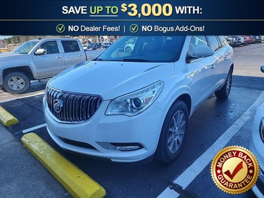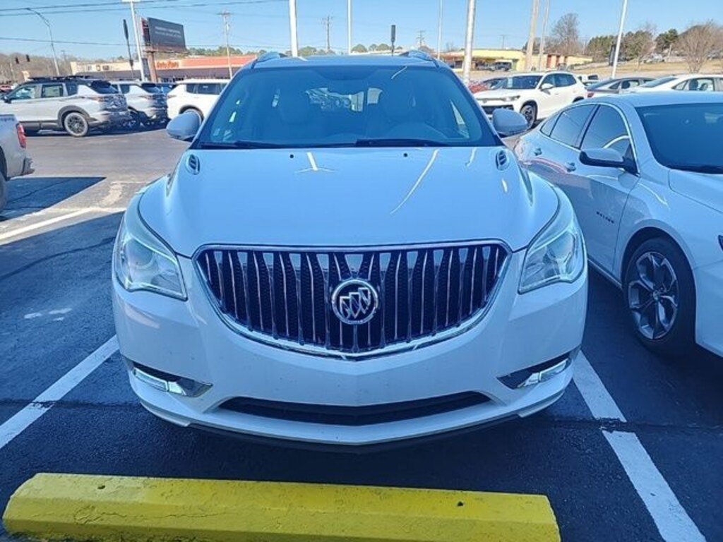 2016 Buick Enclave Leather Group Summit White Leather Group FWD 6-Speed Automatic Electronic with Overdrive 3.6L V6 SIDI VVT FWD, 3.16 Axle Ratio, 3rd row seats: split-bench, 4-Wheel Disc Brakes, 6 Speakers, 7-Passenger Seating, 8-Way Power Driver Seat Adjuster, 8-Way Power Passenger Seat Adjuster, ABS brakes, Air Conditioning, Alloy wheels, AM/FM radio: SiriusXM, Auto-dimming Rear-View mirror, Automatic temperature control, Brake assist, Bumpers: body-color, CD player, Compass, Delay-off headlights, Driver door bin, Driver vanity mirror, Dual front impact airbags, Dual front side impact airbags, Electronic Stability Control, Emergency communication system: OnStar Guidance, Exterior Parking Camera Rear, Four wheel independent suspension, Front anti-roll bar, Front Bucket Seats, Front Center Armrest w/Storage, Front dual zone A/C, Front reading lights, Fully automatic headlights, Garage door transmitter, Heated door mirrors, Heated Driver & Front Passenger Seats, Heated front seats, Heated Steering Wheel, Heated steering wheel, High intensity discharge headlights: Bi-Xenon, Illuminated entry, Leather steering wheel, Low tire pressure warning, Memory seat, Memory Settings, Occupant sensing airbag, Outside temperature display, Overhead airbag, Panic alarm, Passenger door bin, Passenger vanity mirror, Perforated Leather-Appointed Seat Trim, Power door mirrors, Power driver seat, Power Liftgate, Power passenger seat, Power steering, Power Tilt-Sliding Moonroof, Power windows, Preferred Equipment Group 1SL, Radio data system, Radio: Color Touch AM/FM/CD w/IntelliLink, Rear air conditioning, Rear anti-roll bar, Rear Parking Sensors, Rear reading lights, Rear window defroster, Rear window wiper, Remote keyless entry, Roof rack: rails only, Security system, Side Blind Zone Alert w/Cross Traffic Alert, SiriusXM Satellite Radio, Speed control, Speed-sensing steering, Spoiler, Steering wheel mounted audio controls, Tachometer, Telescoping steering wheel, Tilt steering wheel, Traction control, Trip computer, Turn signal indicator mirrors, Variably intermittent wipers, Voltmeter, Wheels: 19" 10-Spoke Aluminum, FWD.