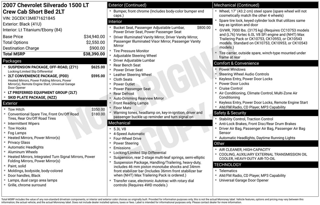 2007 Chevrolet Silverado 1500 LT LT2 Black LT LT2 4WD 4-Speed Automatic with Overdrive Vortec 5.3L V8 SFI Vortec 5.3L V8 SFI, 4-Speed Automatic with Overdrive, 4WD, Lt Titanium/Ebony Leather, 3.73 Rear Axle Ratio, ABS brakes, Air Conditioning, AM/FM radio, Chrome Grille Surround, Color-Keyed Carpeting w/Rubberized Vinyl Floormats, Delay-off headlights, Driver door bin, Dual front impact airbags, Electric Rear-Window Defogger, Electronic Cruise Control w/Set & Resume Speed, Electronic Stability Control, Emergency communication system: OnStar, Front anti-roll bar, Front Center Armrest w/Storage, Front reading lights, Front wheel independent suspension, Fully automatic headlights, Heavy-Duty Auxiliary External Transmission Oil Cooler, Heavy-Duty Rear Automatic Locking Differential, Heavy-Duty Trailering Equipment, Low tire pressure warning, Occupant sensing airbag, Overhead console, Passenger door bin, Passenger vanity mirror, Power Door Locks, Power steering, Rear reading lights, Rear seat center armrest, Rear step bumper, Skid Plate Package, Solar-Ray Deep-Tinted Glass, Spare Tire Lock, Split folding rear seat, Tachometer, Tilt steering wheel, Variably intermittent wipers, Vortec 5.3L V8 SFI, 4-Speed Automatic with Overdrive, 4WD, Lt Titanium/Ebony Leather.
