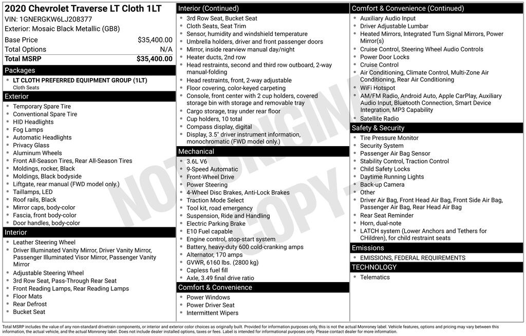 Take on every road trip, daily commute, and family adventure in the 2020 Chevy Traverse FWD 1LTa perfect blend of bold design, smooth performance, and all the space you need. Finished in Mosaic Black Metallic with a sleek Jet Black Cloth Interior, this SUV brings both style and practicality to the table.